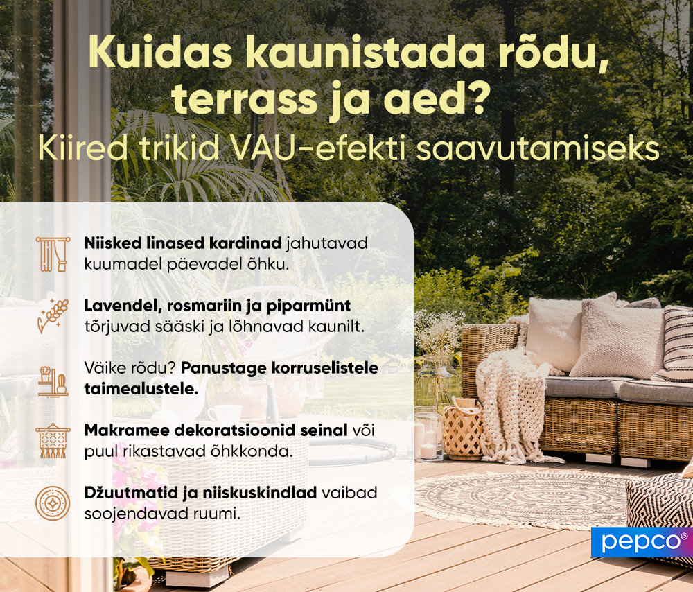 Teie vajadustele vastava stiilse ja mugava ruumi loomiseks piisab mõnest hästi valitud kaunistusest ning funktsionaalsetest aksessuaaridest. Valgustus, taimed, tekstiilid ja praktilised aksessuaarid võivad täielikult muuta isegi väikese rõdu või aia olemust. Ja mis kõige parem, ei nõua suuri rahalisi kulutusi ega aeganõudvaid remonditöid – piisab kübekesest loovusest.
