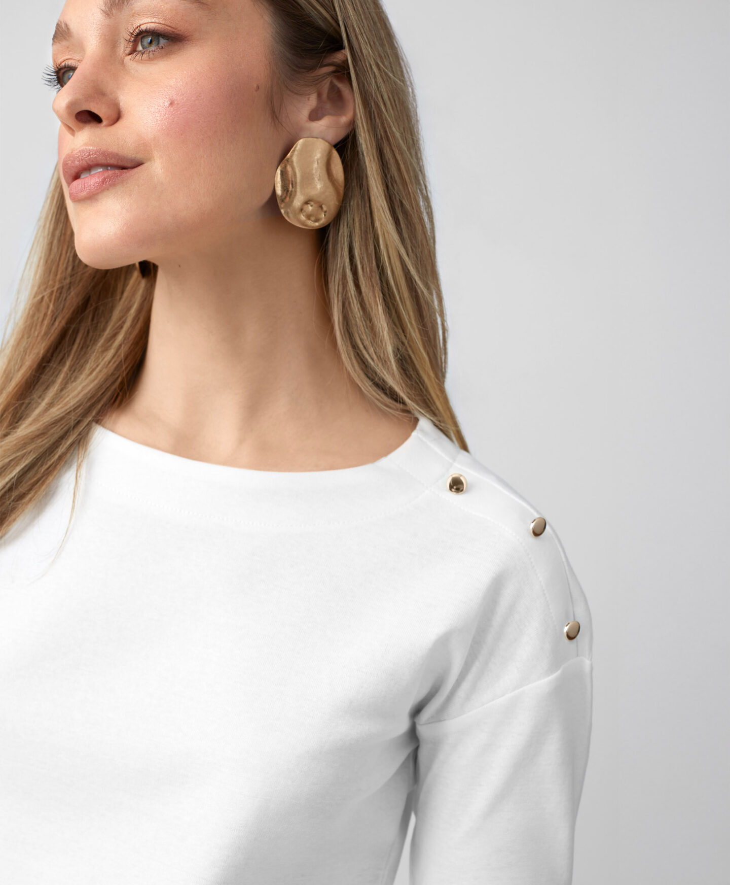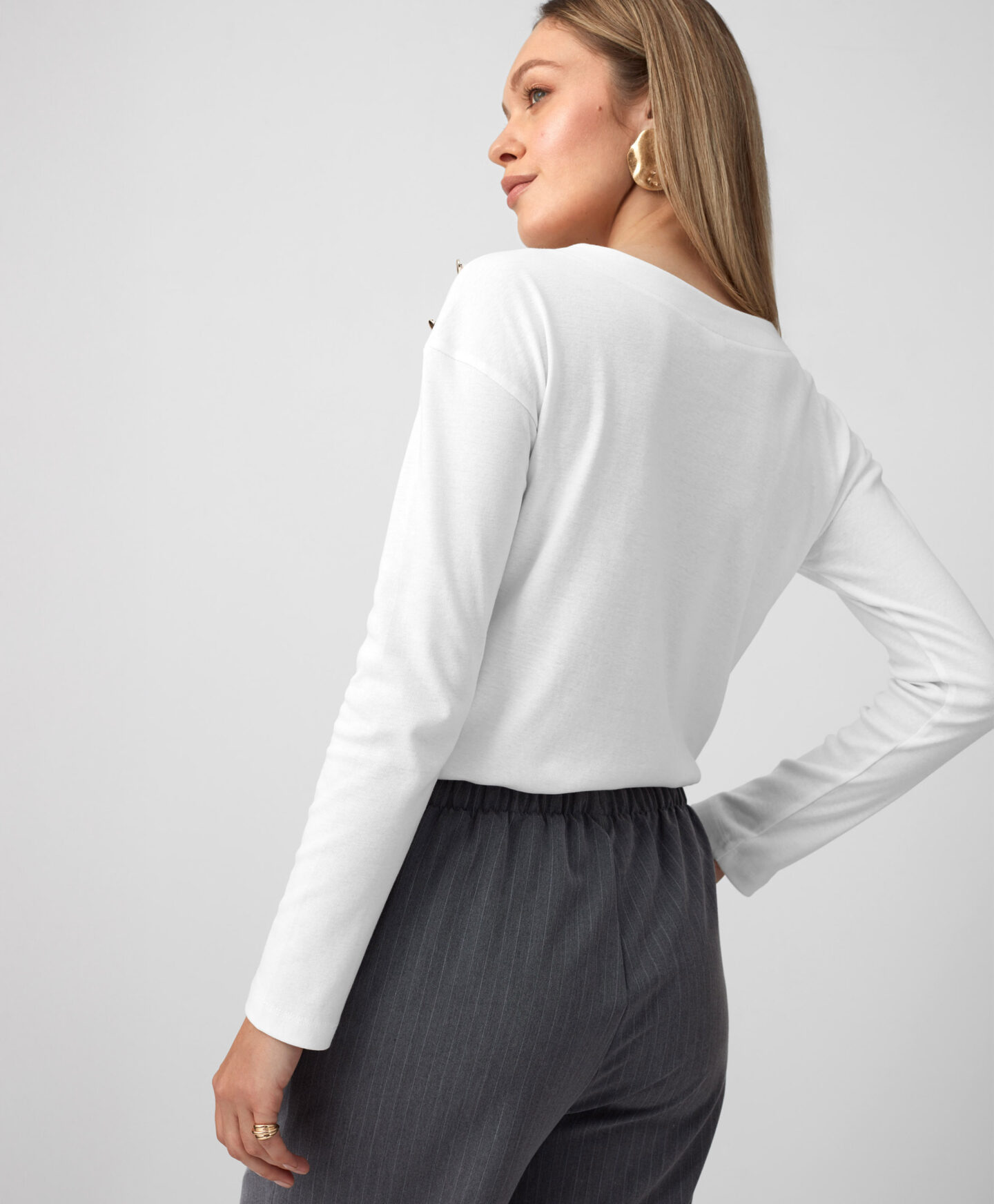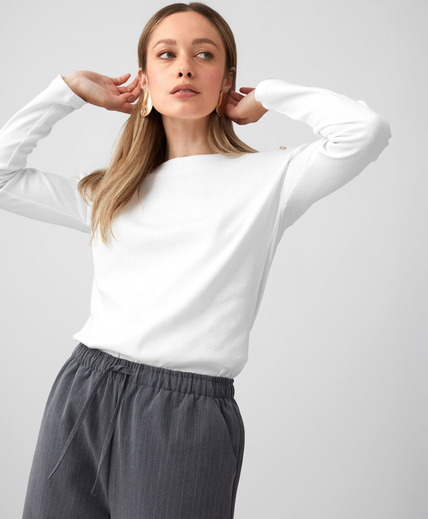 Pikkade varrukatega 100% puuvillane soonikkoes T-särk on suurepärane valik jahedamateks ilmadeks. Puuvillane materjal tundub seljas mugav. Kanna seda T-särki argipäeval näiteks koos teksapükste või seelikuga.