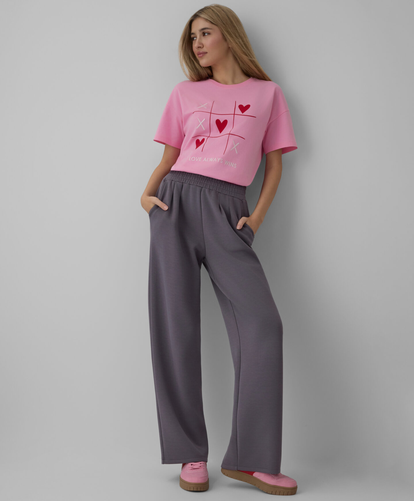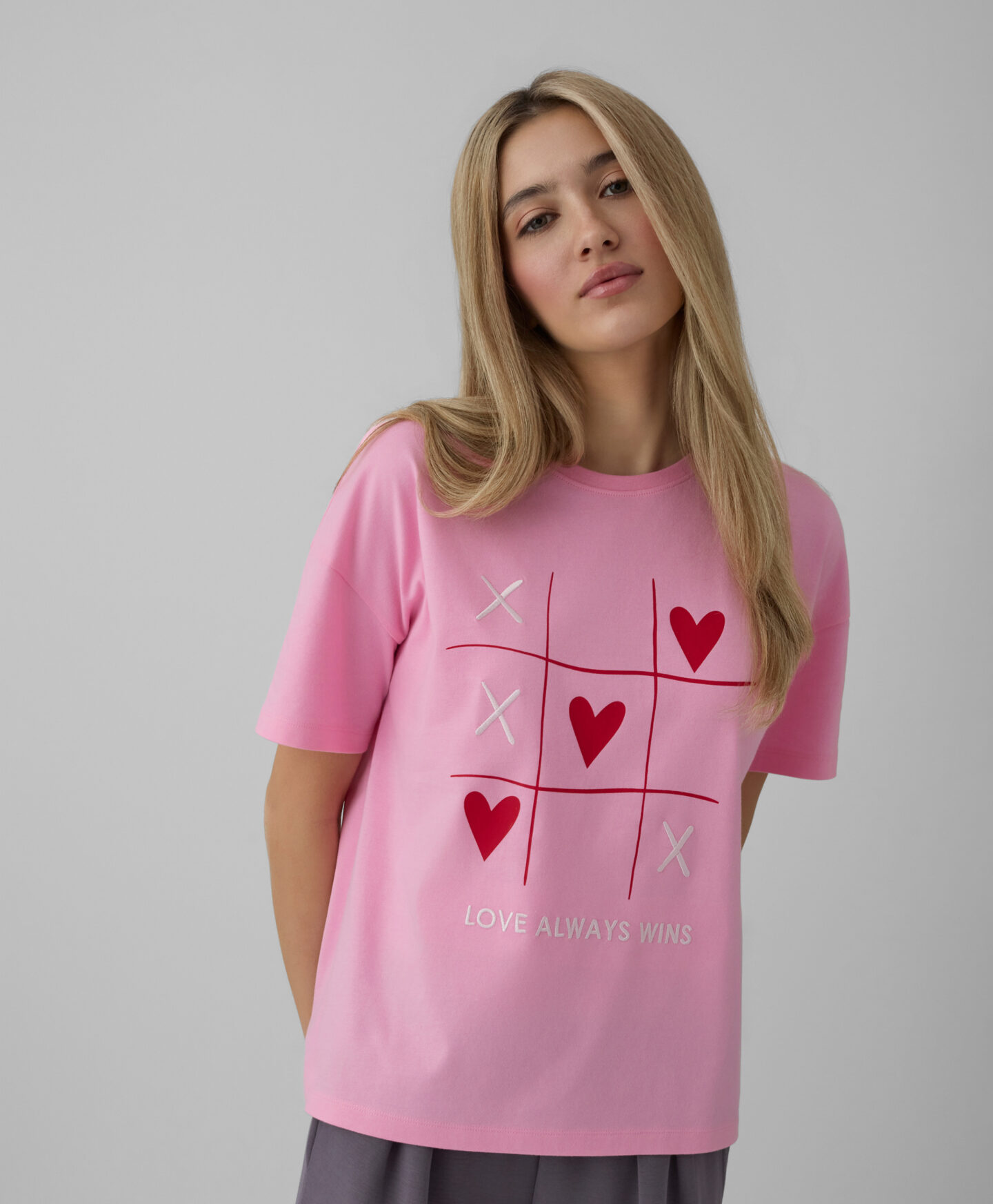 Lühikeste varrukatega 100% puuvillane südametega T-särk sobib hästi igapäevaseks kandmiseks. See on väga mitmekülgne. Pehme kangas laseb nahal hingata ja on mugav. Pilkupüüdev südametega pealetrükk lisab igale riietusele romantikahõngu.