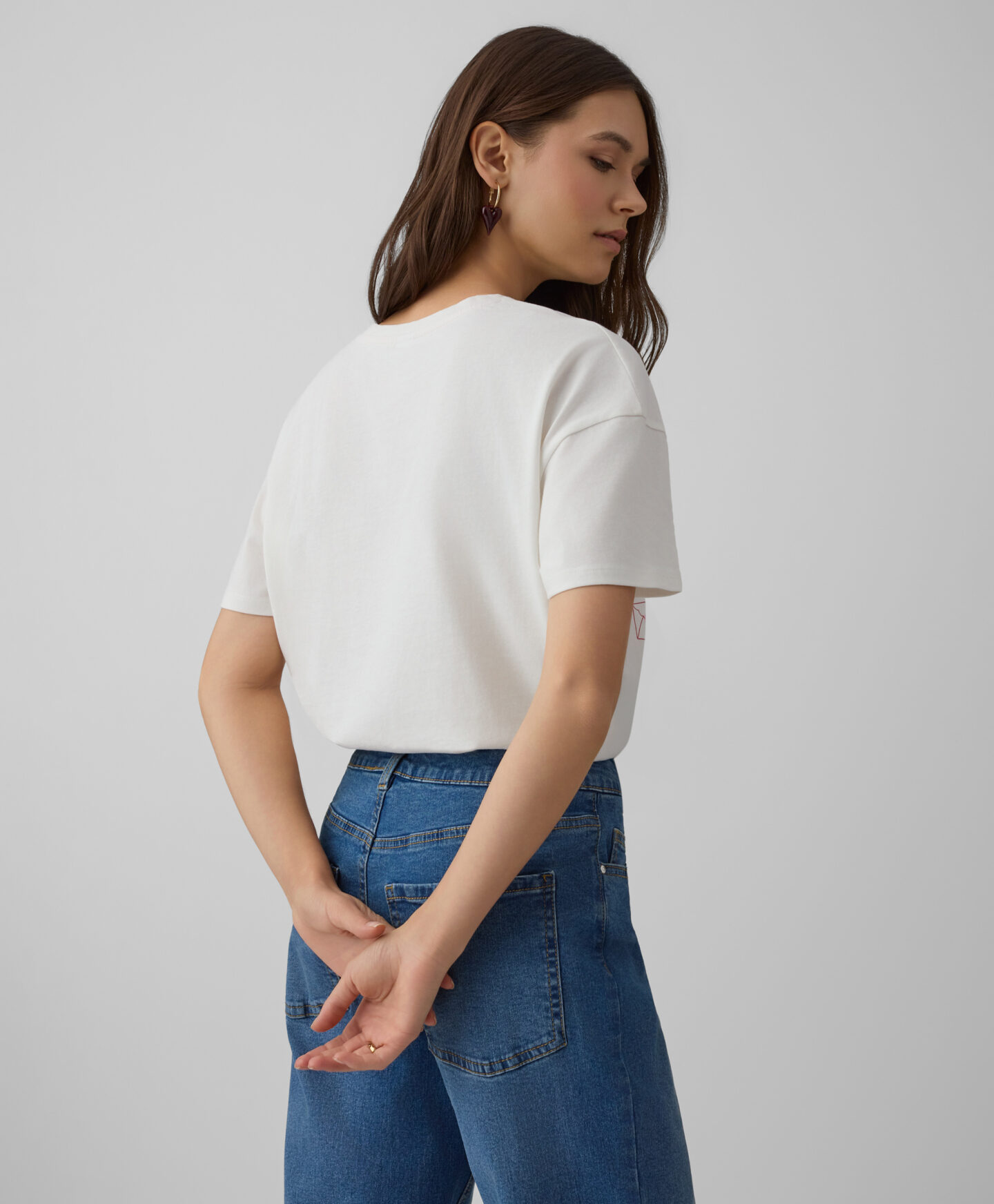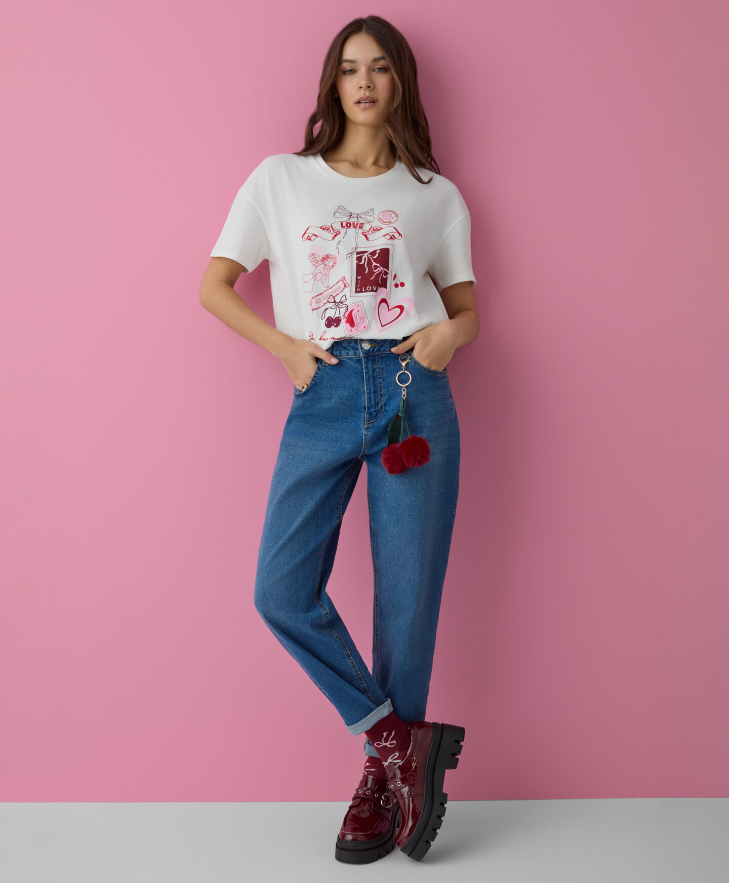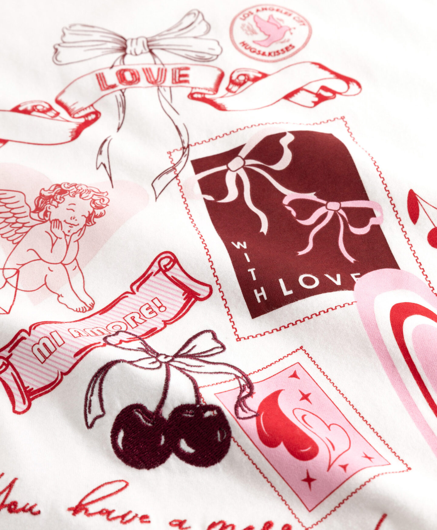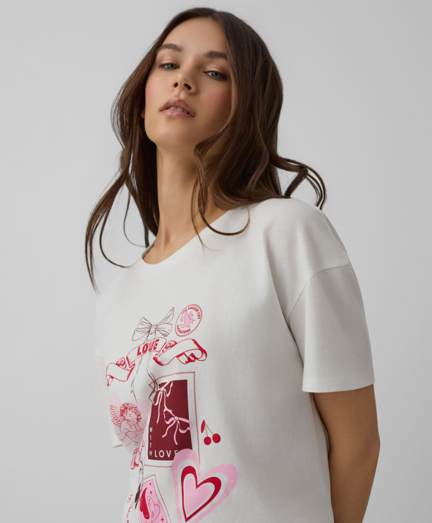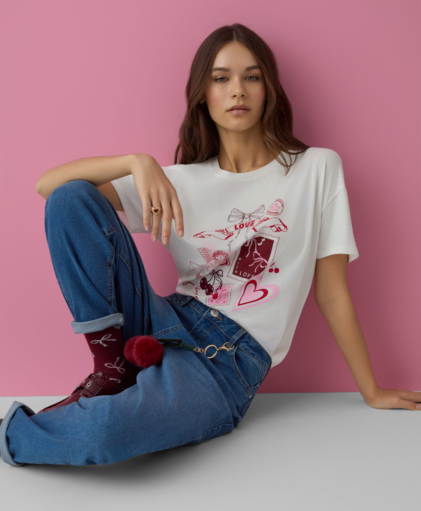 Lühikeste varrukatega sõbrapäevateemaline 100% puuvillane T-särk on hea valik igapäevaseks kandmiseks. See on väga mitmekülgne. Pehme kangas laseb nahal hingata ja on mugav. Särgiesist kaunistav pealetrükk lisab igale riietusele romantikahõngu.