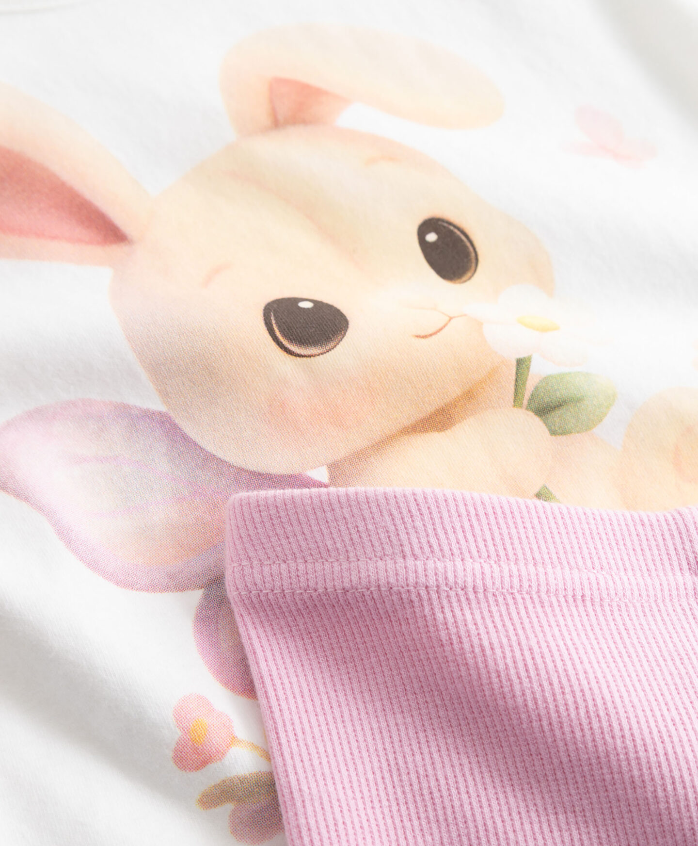 Beebikomplekt koosneb T-särgist ja jalgrattapükstest. T-särk on valmistatud pehmest puuvillasest materjalist, mis on tundlikule nahale meeldiv, ja esiküljel olev jänesepilt võlub iga väikese armsa looma südame. Kõrge puuvillasisaldusega retuusid on elastsed, seega ei piira need liikumist ja mängulisust.