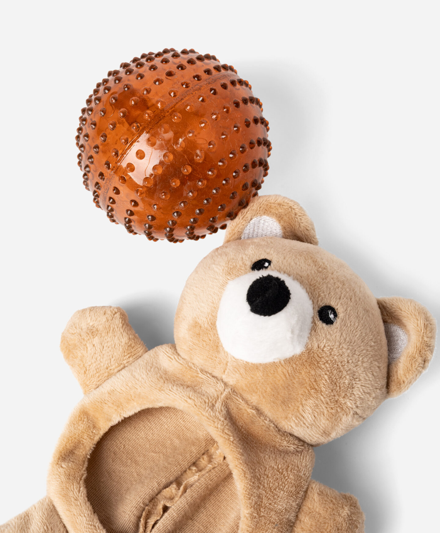 Beež pehme koera mänguasi on ideaalne lahendus koertele, kes armastavad interaktiivseid ja pehmeid mänguasju. Pehmest, kuid vastupidavast materjalist valmistatud mänguasi tagab ohutuse mängu ajal ning kaasasolev pall lisab lõbu ja julgustab koera aktiivsena püsima.
