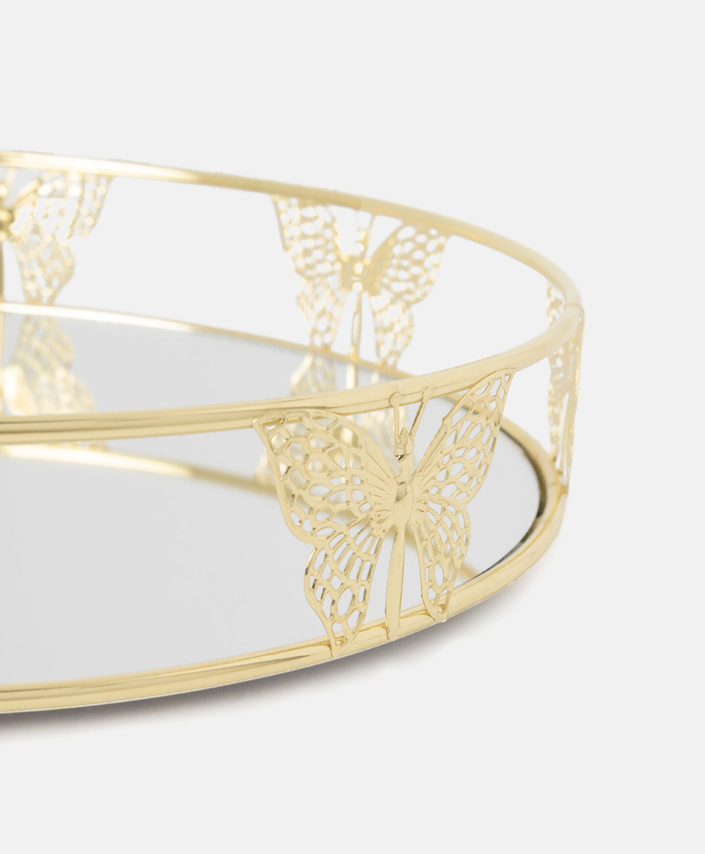 Peeglipõhjaga dekoratiivne kandik on maitsekas sisustuselement. See kaunistab nii elutuba, kööki kui ka magamistuba. Tõsta sellele näiteks lõhnaküünlad ja mõni vaas või kasuta seda hoopis jookide ja maiustuste serveerimiseks. Kuldne liblikamotiiv annab kandikule õhulise ilme ja peeglipind püüab hästi valgust.