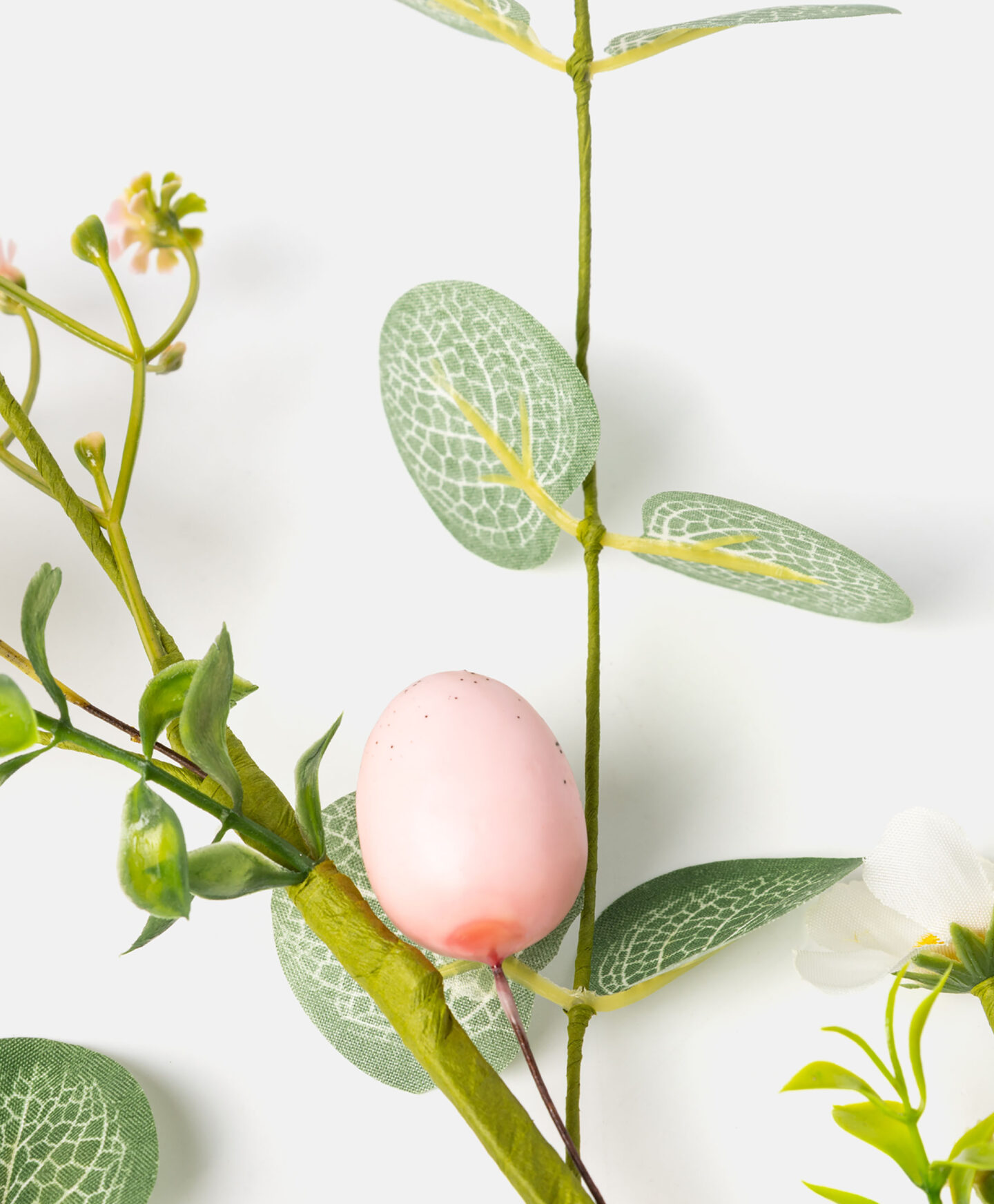 See 60 cm kõrgune dekoratiivne oks värviliste lihavõttemunade ja lilledega on ideaalne lahendus neile, kes otsivad valmis ja suurejoonelist kaunistust. Saate seda kasutada suurema lauakompositsiooni loomiseks või istutada potti, et anda oma kodulilledele lihavõttehõng. See sobib hästi ka kimbu osana või üksi vaasis. Too kevad tuppa selle dekoratiivse oksaga!