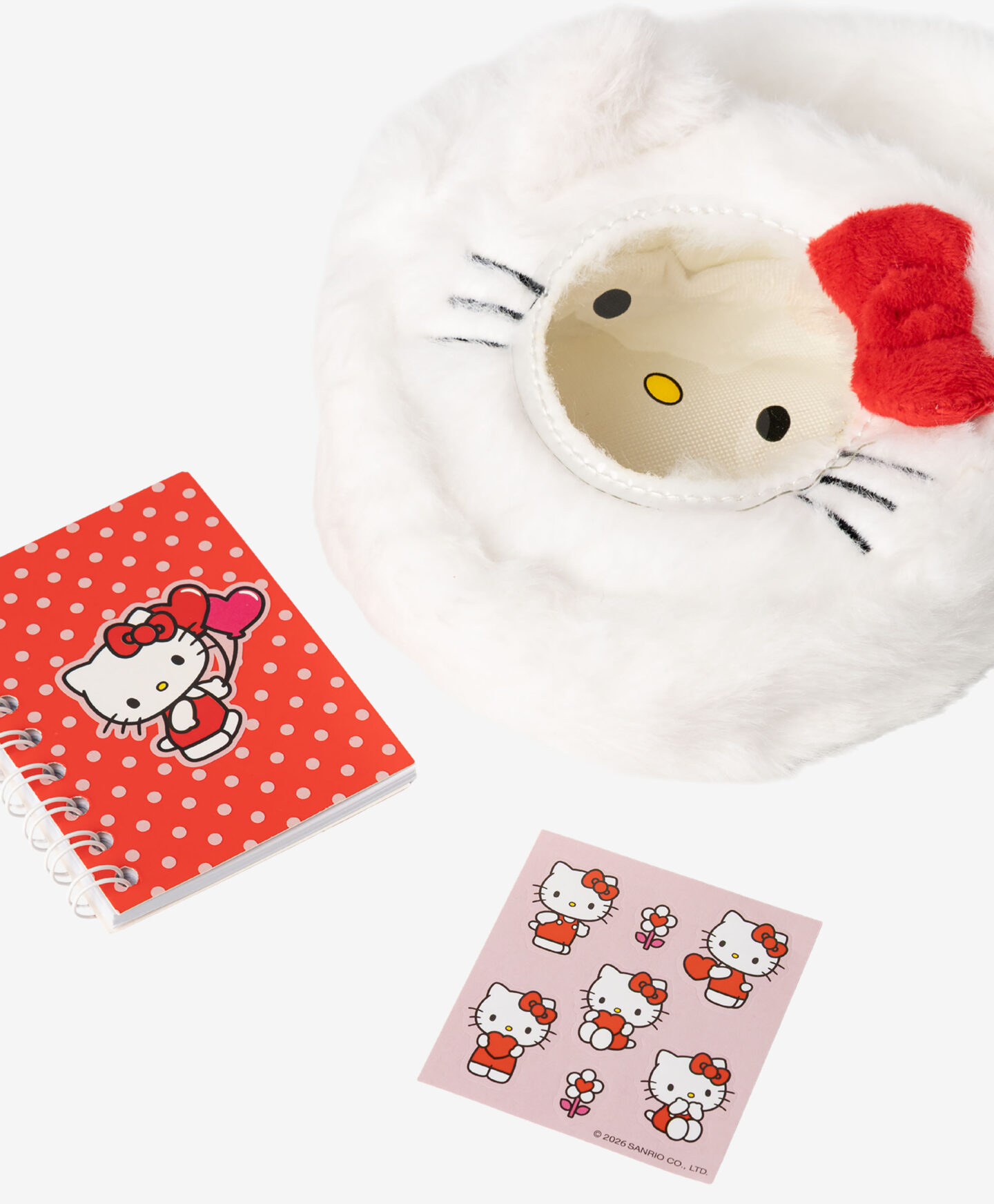 HELLO KITTY komplekti kuulub karvane rahakott ja kleepsumärkmik. Komplekt teeb tuju heaks igal HELLO KITTY fännil. See on kompaktne, näeb armas välja ja seda on mugav igale seiklusele kaasa võtta. Sangaga rahakotti kaunistab HELLO KITTY kuulus punane lehv.