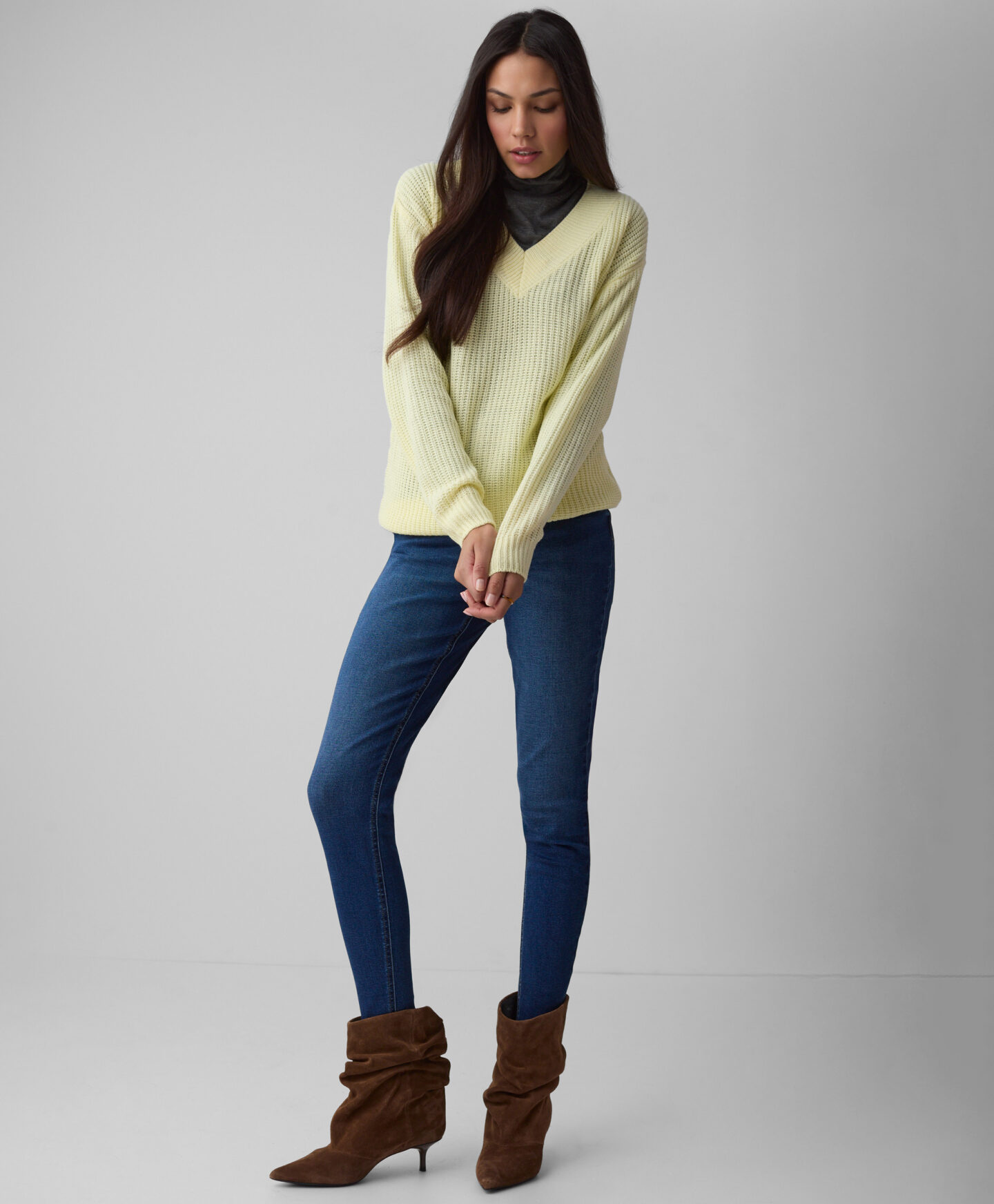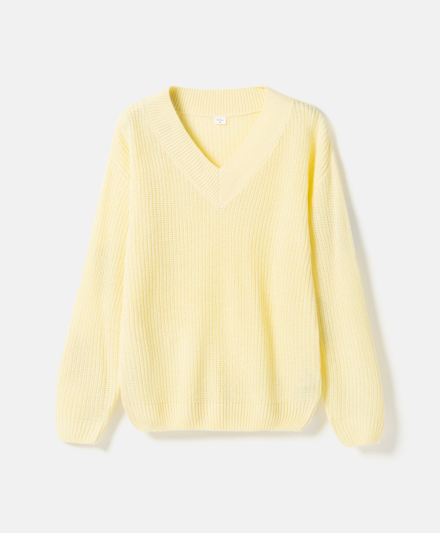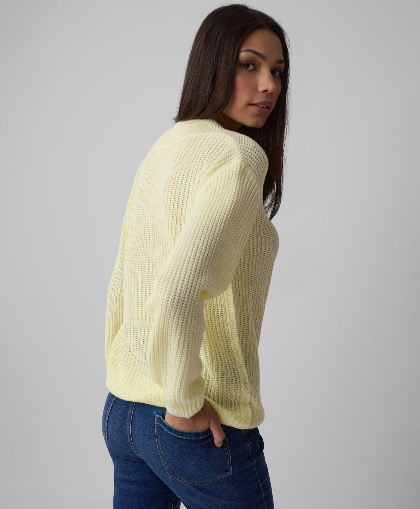 V-kaelusega kollane kampsun on ideaalne igapäevaseks kandmiseks. See on suurepärane valik T-särgi või elegantse pluusi peale tõmbamiseks. Eesmine lõige rõhutab kaela joont ja muudab selle visuaalselt saledamaks, samas kui punutud kudum lisab riietusele karakterit. Kampsun on soe, pehme ja väga naiselik. Saadaval on kaks mustrit.
