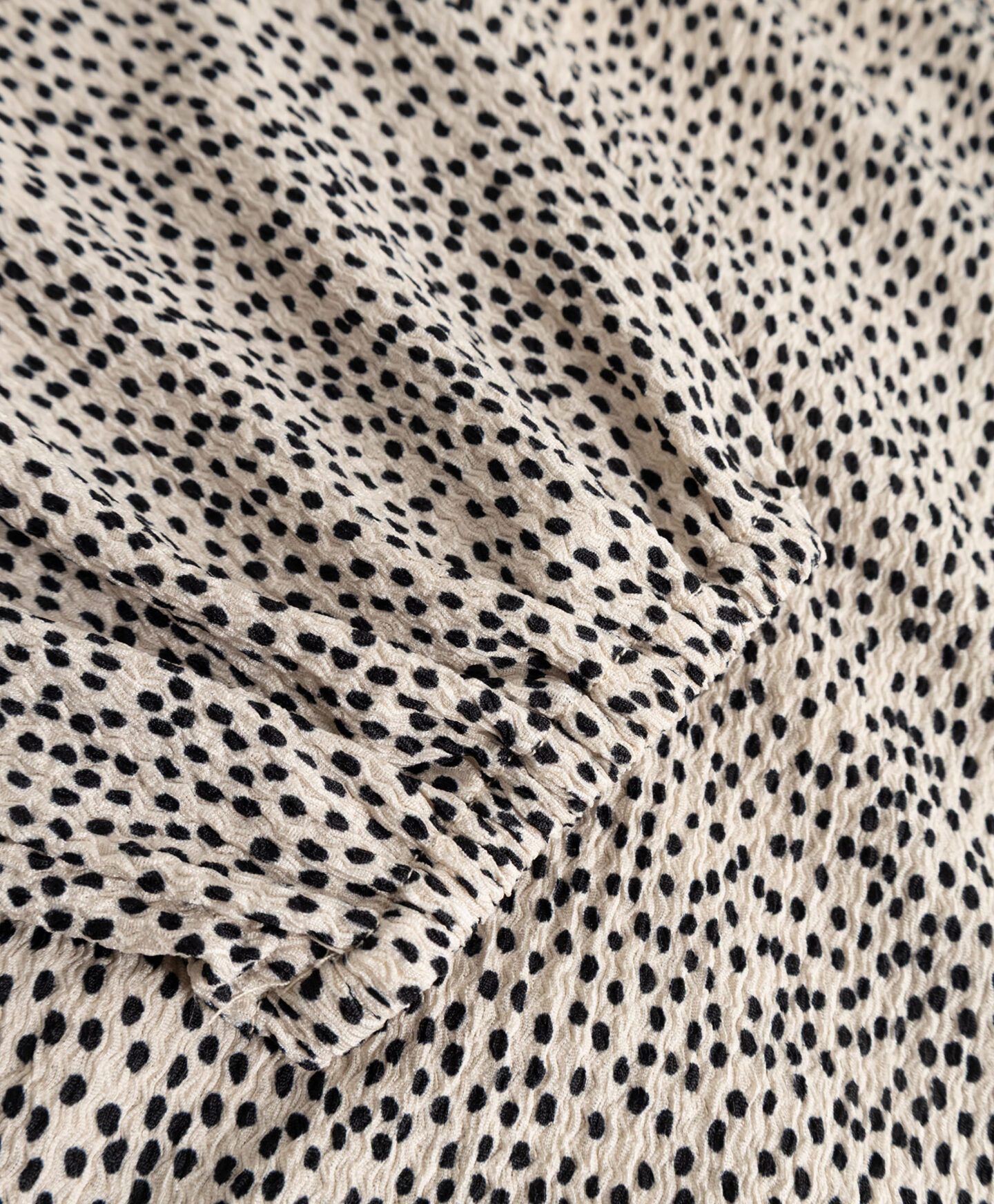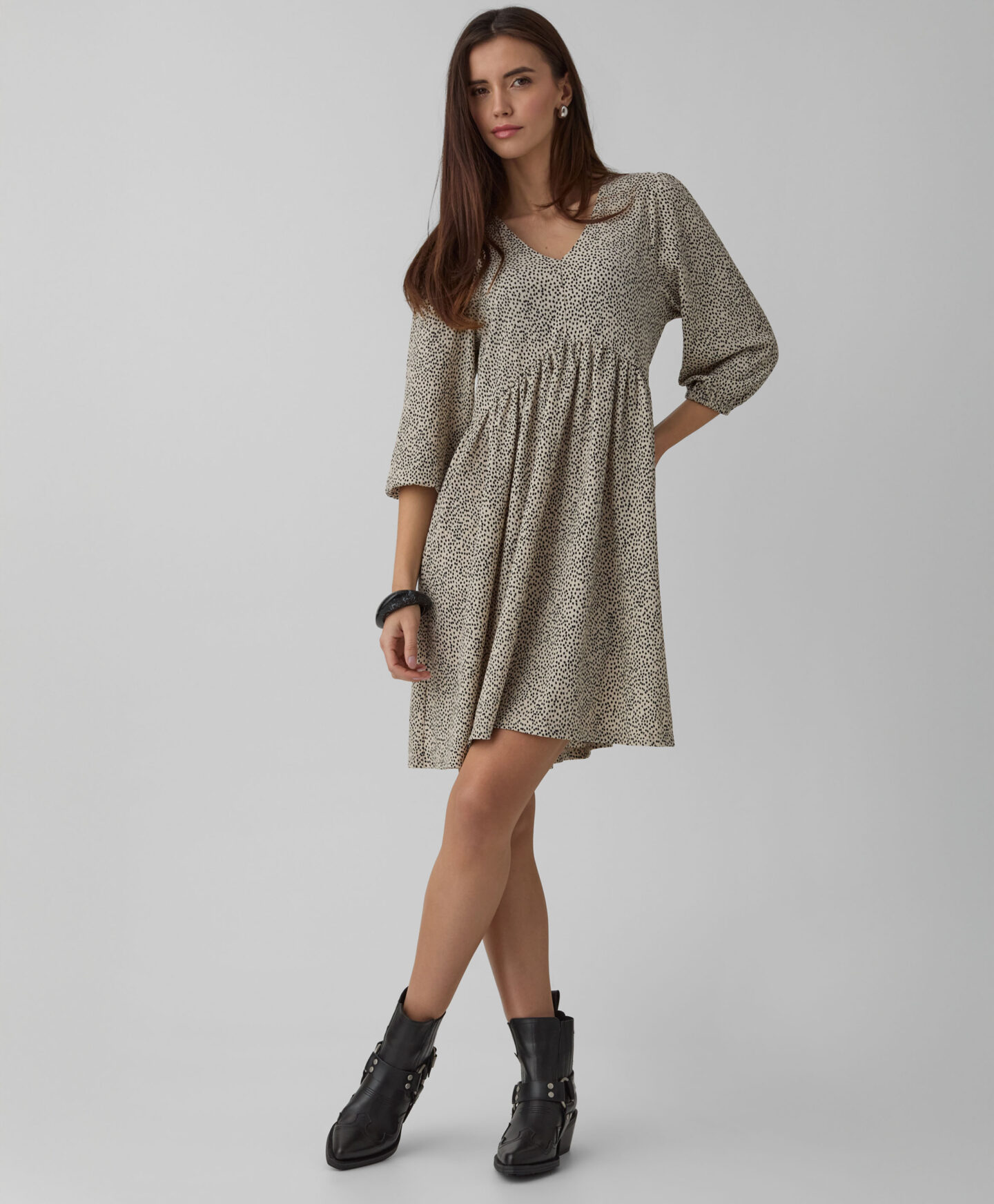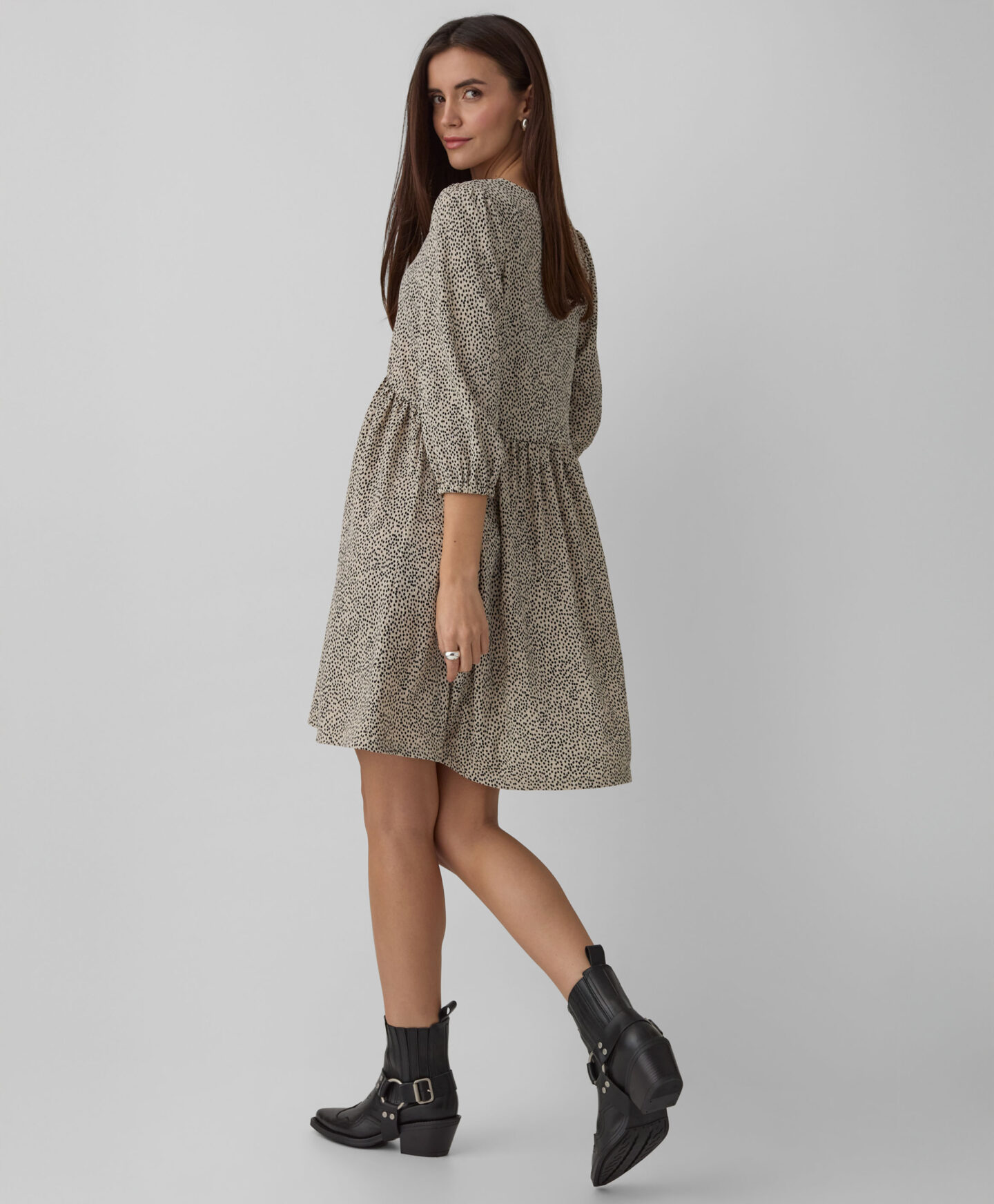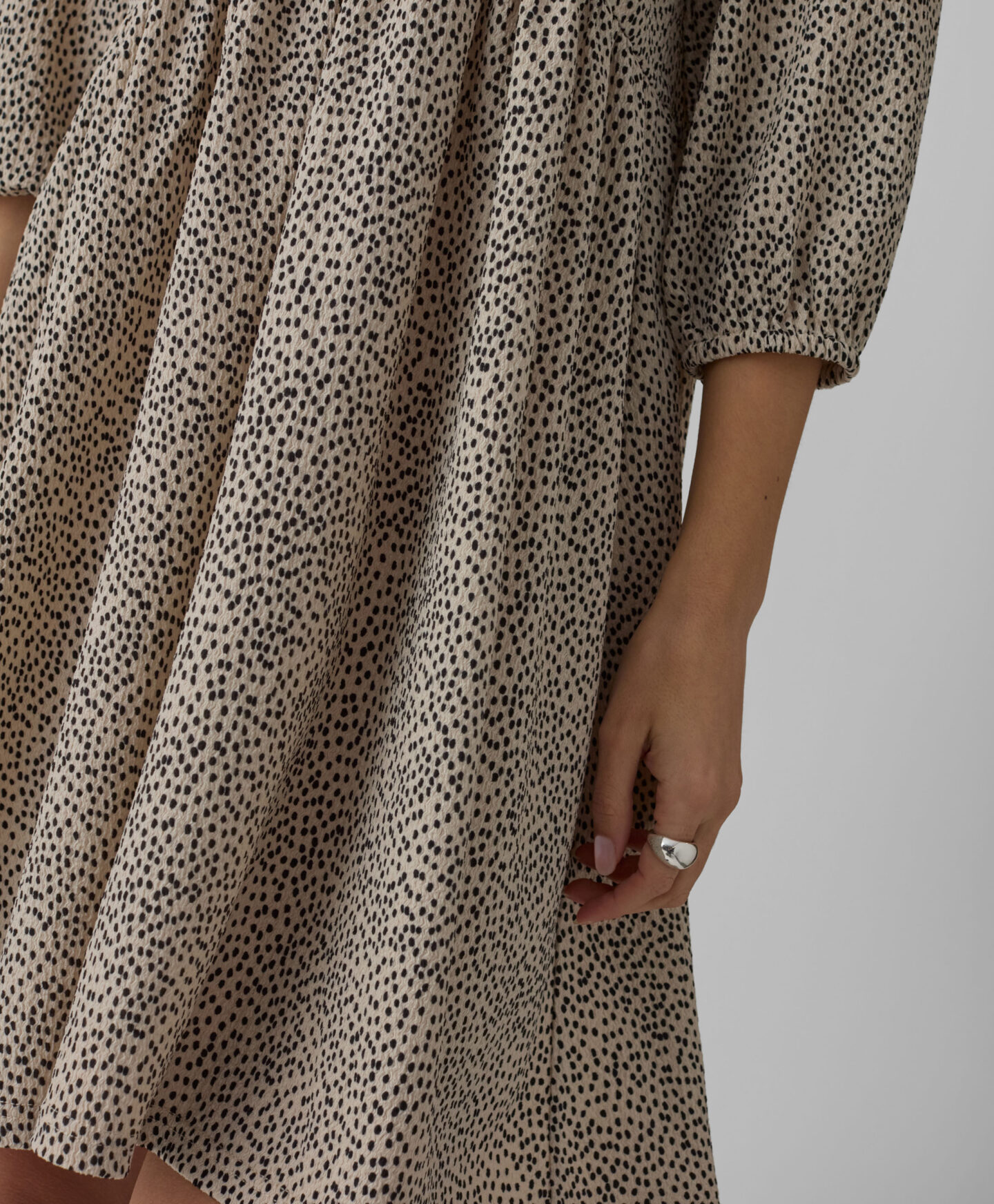 Kleit paistab silma ebakorrapärase kortsulise mustriga, mis annab rõivale iseloomu. Iseloomulikud voldid loovad kolmemõõtmelise vormi ja modelleerivad kaunilt siluetti. Õrn V-kaelus rõhutab kaela ning lisab üldilmele kergust. Pehme kangas tagab mugavuse kogu päevaks. Kleit sobib kandmiseks nii spordijalatsite, baleriinade kui ka saabastega.