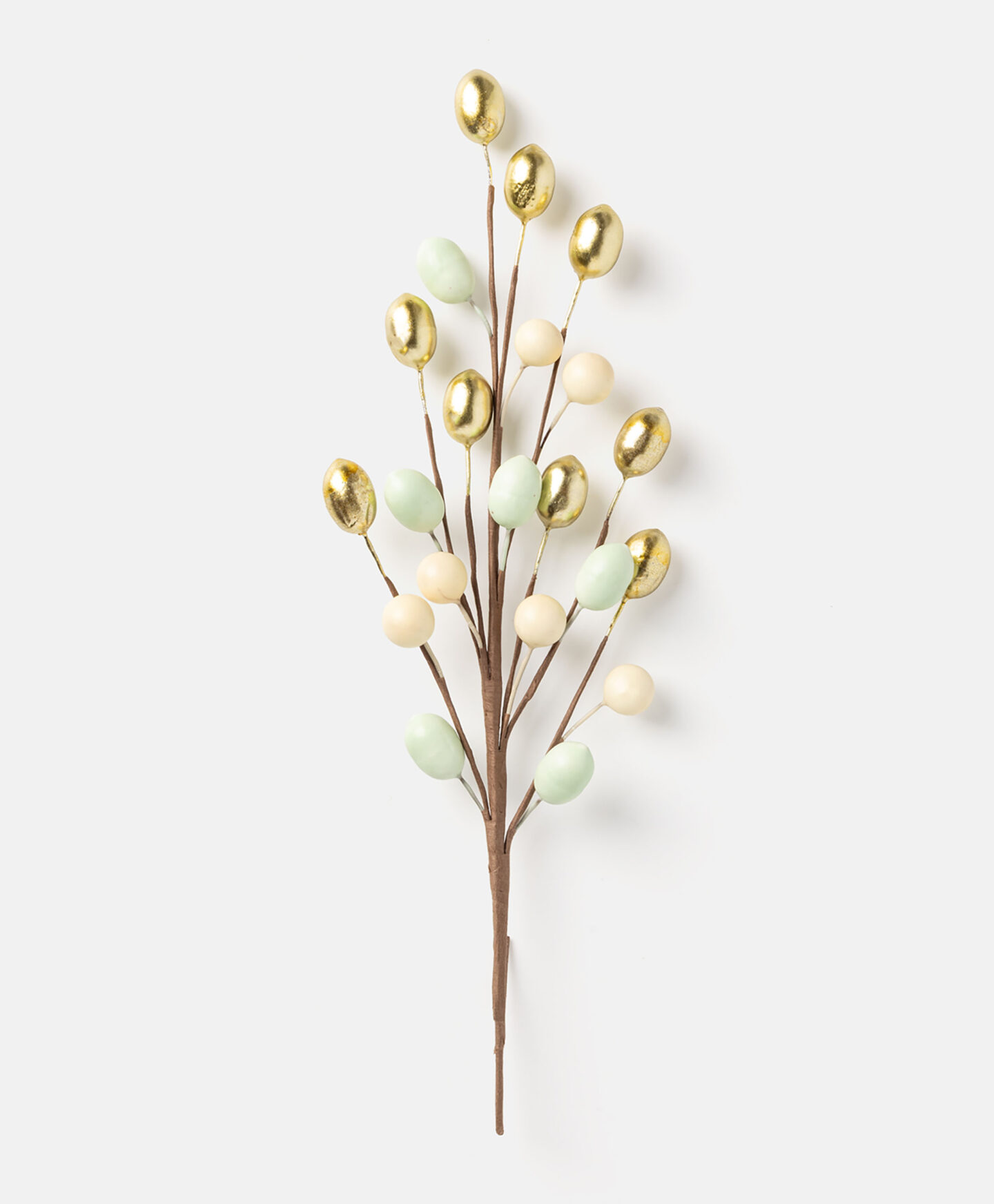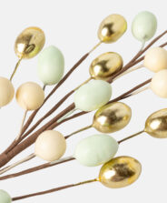 Kuldsete lihavõttemunadega oks loob igas interjööris lihavõttemeeleolu. See sobib hästi nii korvielemendiks kui ka piduliku laua kaunistuseks. Aseta see potti või aseta see vabalt laudlinale, et lihavõttehommikusöögi ajal silmailu pakkuda.