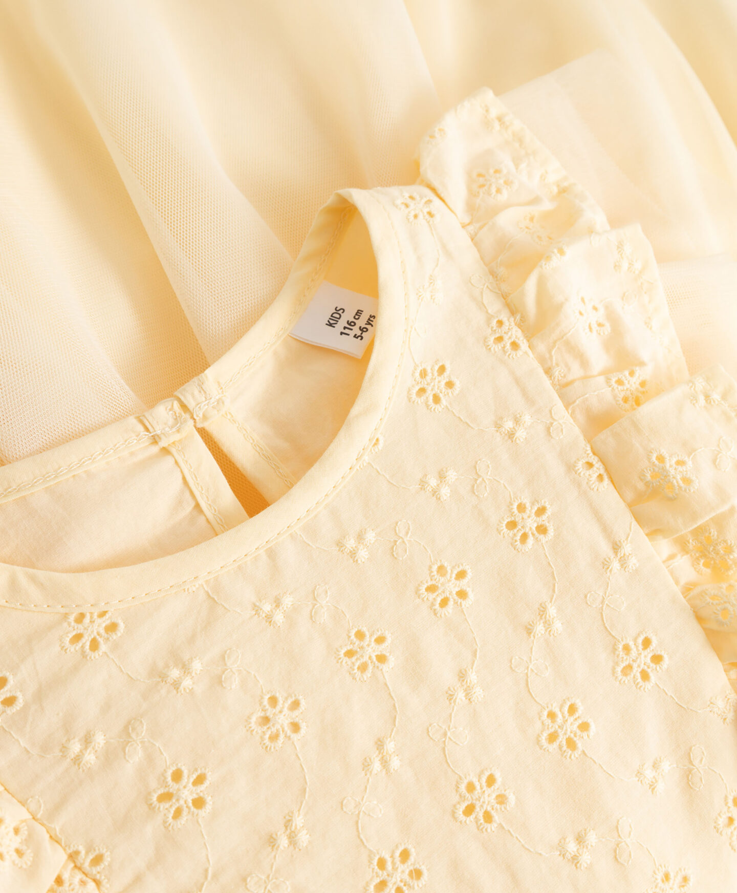 Pastellkollane tüllseelikuga laste kleit paneb iga lapse välja nägema nagu päikesekiir. Kaunis pihik, mis on perforeeritud peente lilleliste detailidega, lisab stiilset elegantsi. Tüllist liblikvarrukad annavad kleidile kerge ja õhulise tunde. Tüllseelik on kerguse ja peenuse kehastus. See on ideaalne valik päikeseliseks ja soojaks päevaks.