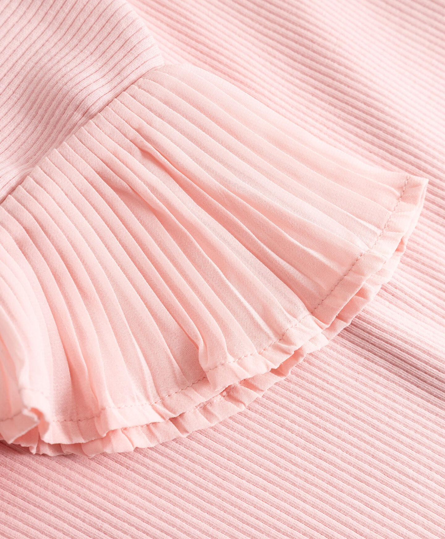 Pastellvärvides šifoonvarrukatega laste T-särk rõõmustab iga väikest last. See on valmistatud soonikkoes kangast ja on mugav kanda. Plisseeritud šifoonvarrukad lisavad elegantsi ja kergust, luues silmatorkava kontrasti sileda kehaga. Selle T-särgi peen välimus sobib ideaalselt elegantseteks pereõhtusöökideks ja sõpradega kohtumisteks. Selle mitmekülgne lõige ja õrn värv muudavad selle ideaalseks tüdrukutele, kes hindavad nii mugavust kui ka stiili. T-särk sobib ideaalselt plisseeritud seeliku ja sobivate pükstega.