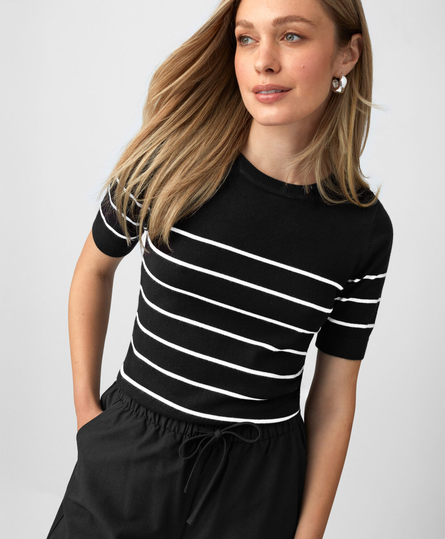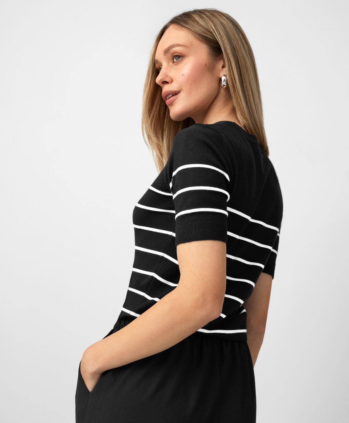 Viskoosisisaldusega must triibuline kampsun on hea valik kõigile, kes hindavad elegantsust ja mugavust. See on valmistatud kvaliteetsetest materjalidest, tundub katsudes pehme ja seljas ülimugav. Klassikaline triibumuster ja tagasihoidlik värvus sobivad nii argipäevaks kui ka pidulikuma riietuse juurde.