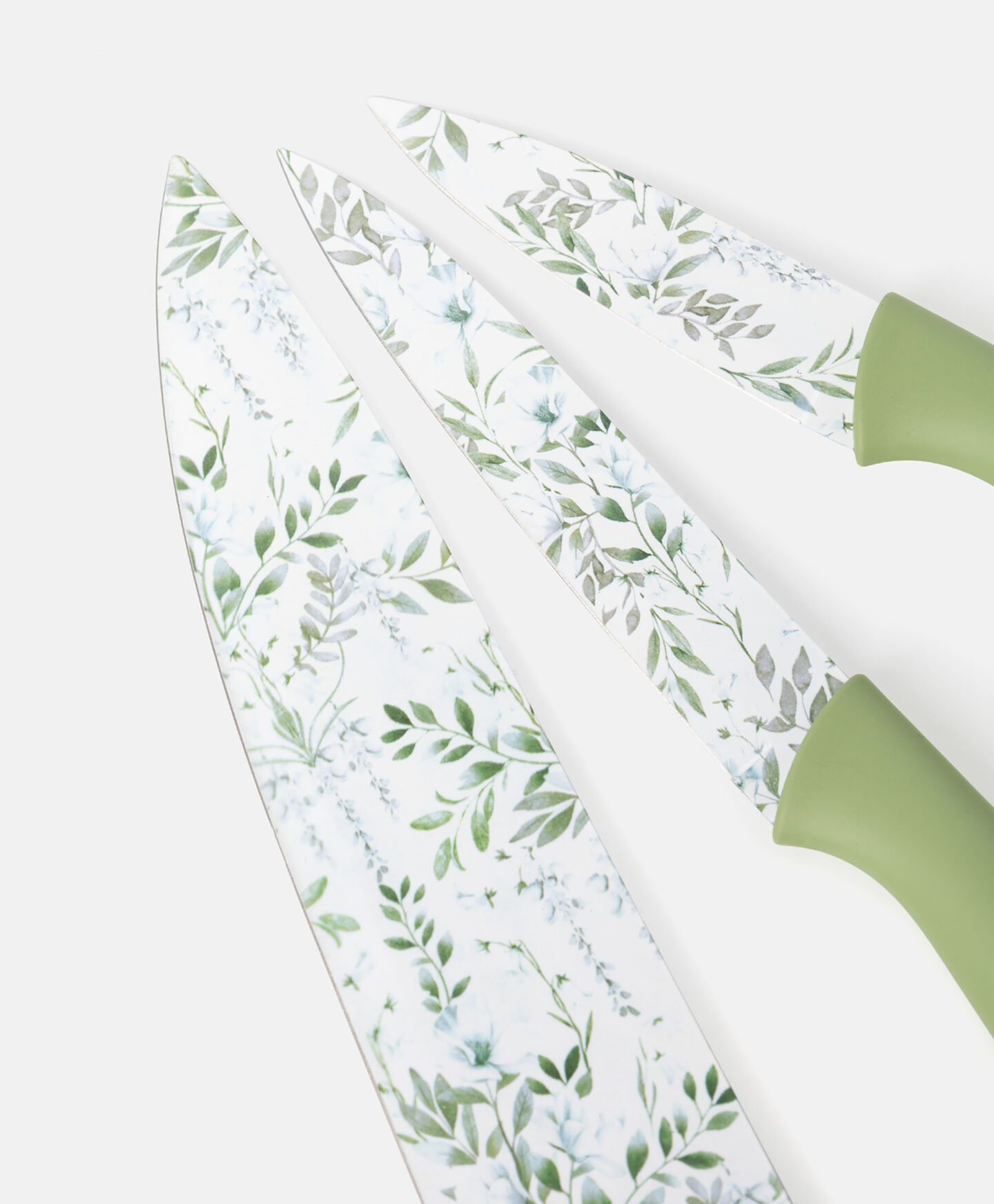 Nugade komplektis on 3 eri suuruses nuga, mis teevad toiduvalmistamise mugavamaks. Tükelda nendega liha, kala, köögi- ja puuvilju või haki maitsetaimi. Roostevaba teras püsib kaua terav ka igapäevasel kasutamisel ning seda on lihtne puhastada. Pastellrohelise ergonoomilise käepidemega nugade peal on ilus kevadine muster, mis lisab kööki värvi. Saadaval on ka samas stiilis lõikelauad.