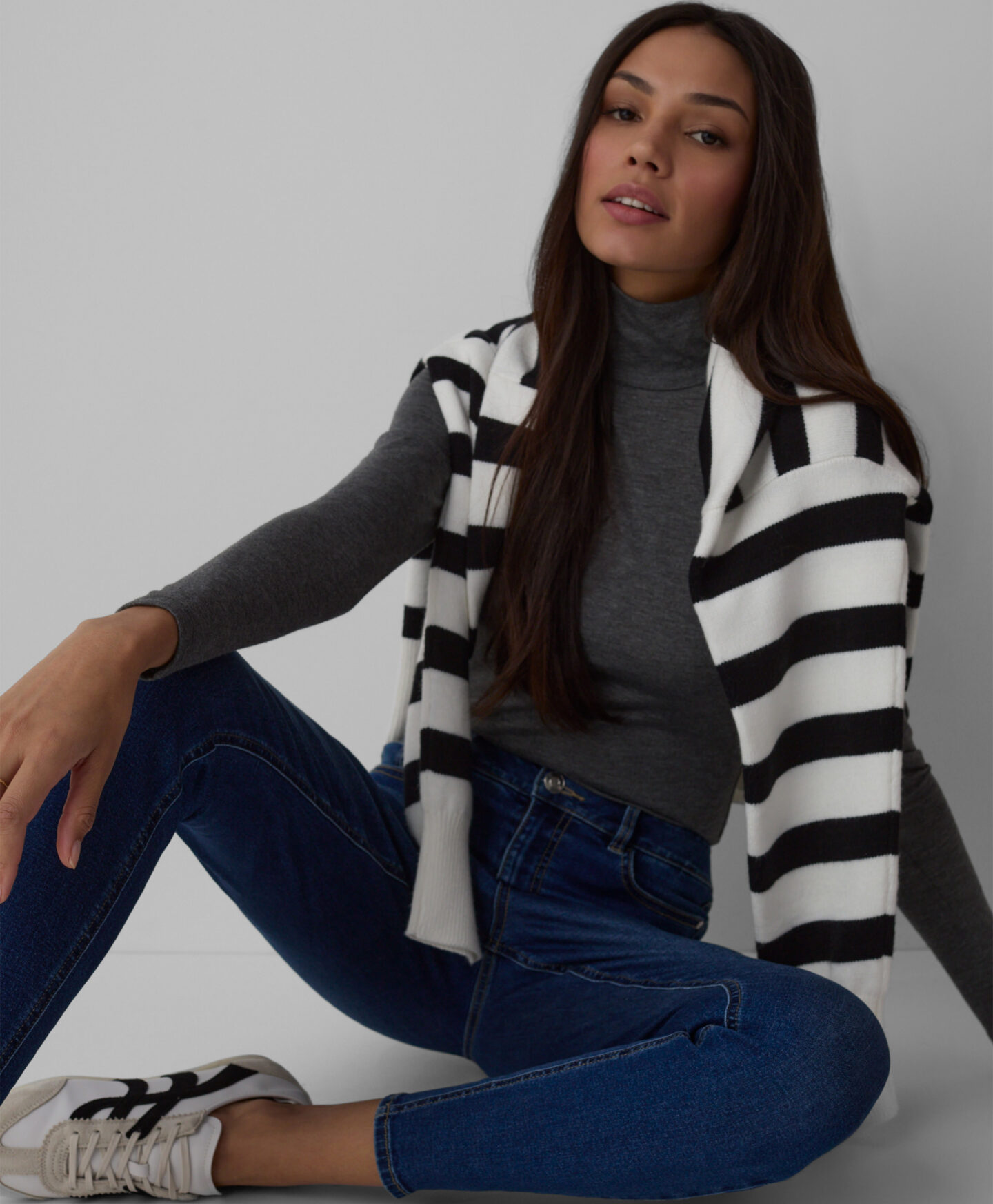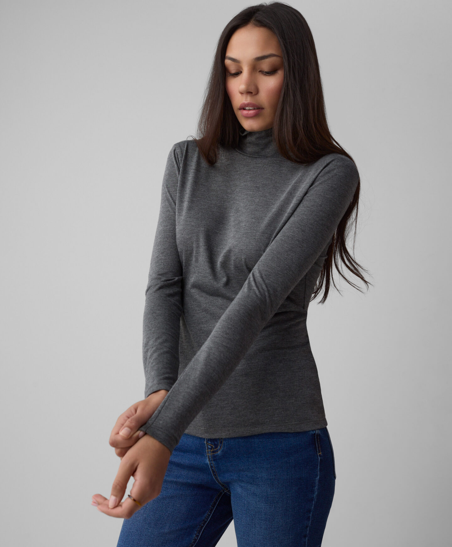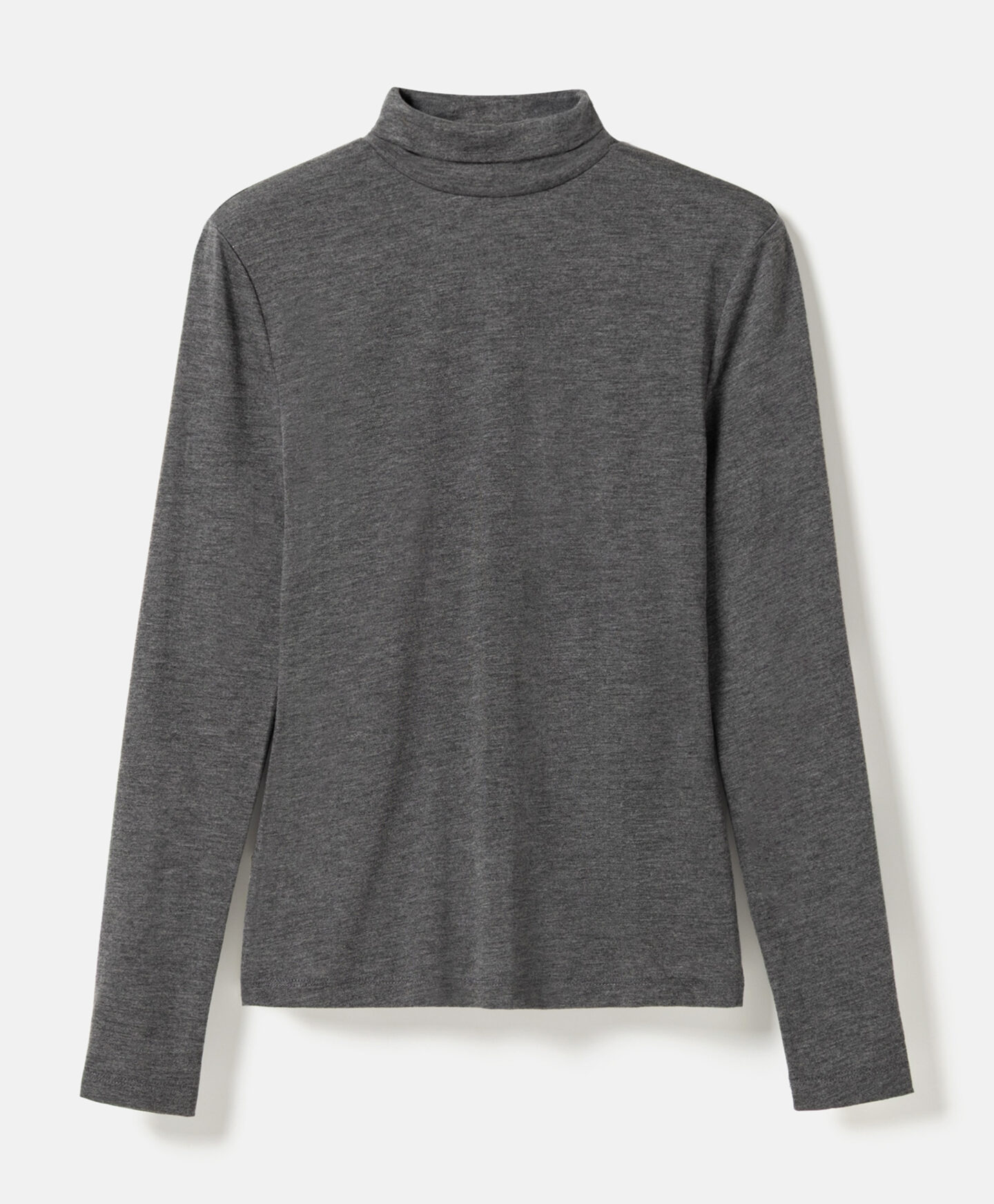 Pikkade varrukate ja kõrge kaelusega T-särk sobib ideaalselt külmadeks kuudeks. Suurepärane bleiseri või kampsuni alla. See sobib nii teksade kui ka elegantsete pükstega. Universaalne värv sobib hästi talvisesse atmosfääri ja võimaldab luua palju edukaid kombinatsioone.