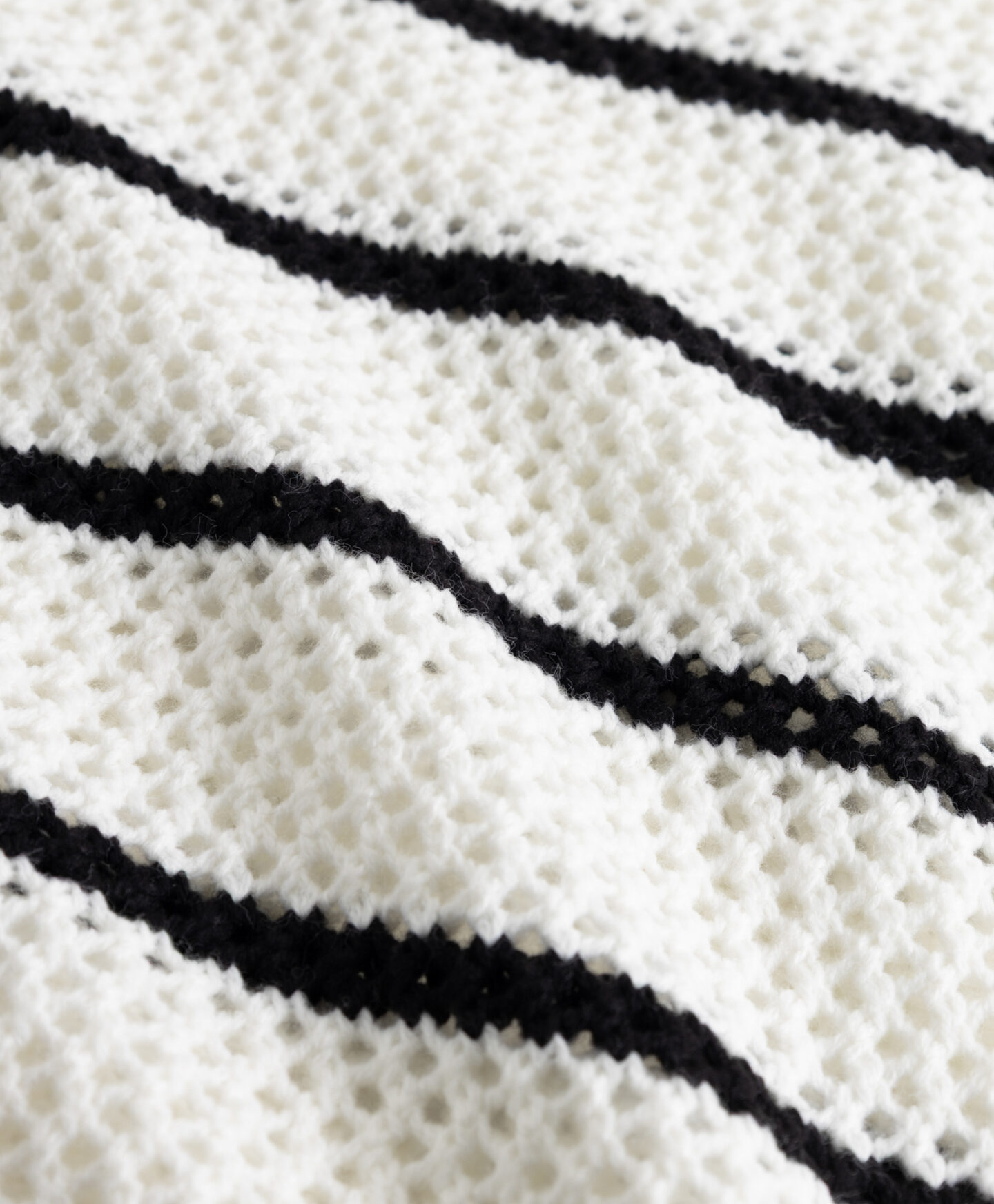 Triibuline pitsilise mustriga kampsun on moekas valik. Pitsiline muster on hingav ja näeb ilus välja. Kampsun on maitsekas täiendus nii argise kui ka elegantse riietuse juurde.