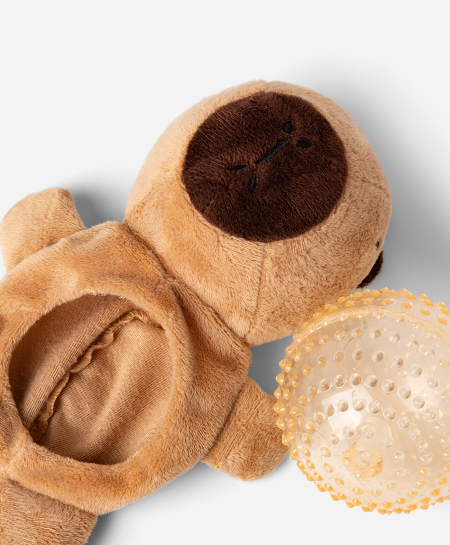 Pruun pehme koera mänguasi palliga on ideaalne lahendus koertele, kes armastavad interaktiivseid ja pehmeid mänguasju. Pehmest, kuid vastupidavast materjalist valmistatud mänguasi tagab mängu ajal ohutuse ning kaasasolev pall lisab mängurõõmu ja julgustab koera aktiivsena püsima.