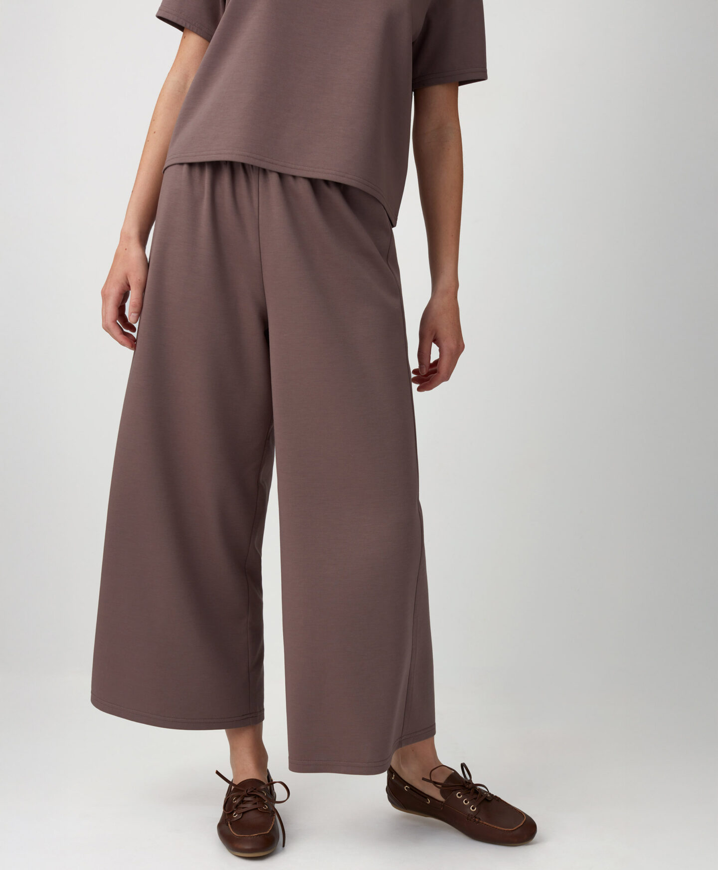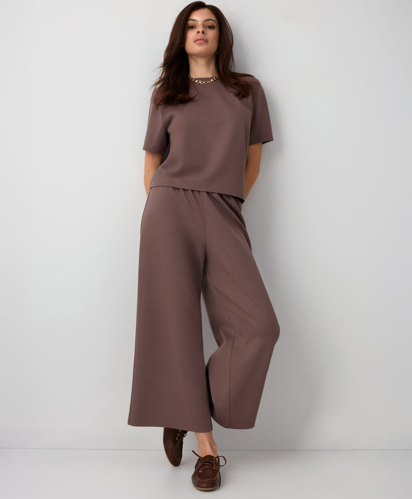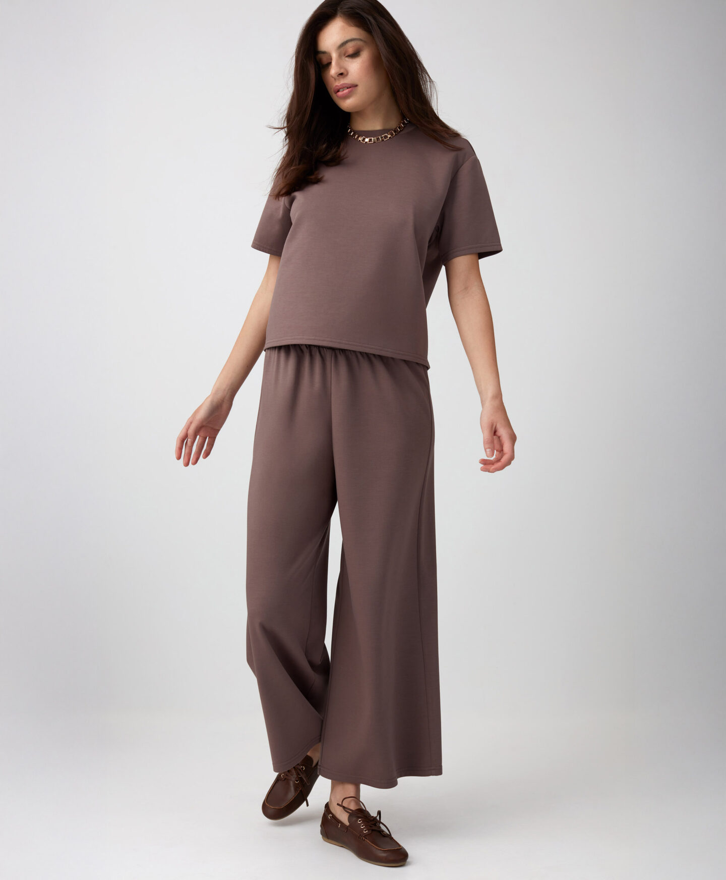 Pruunid püksid on jalas mugavad ja stiilsed. Moekast paksust kangast püksid sobivad suurepäraselt tänapäevase ja mugava komplekti kokkupanemiseks.
