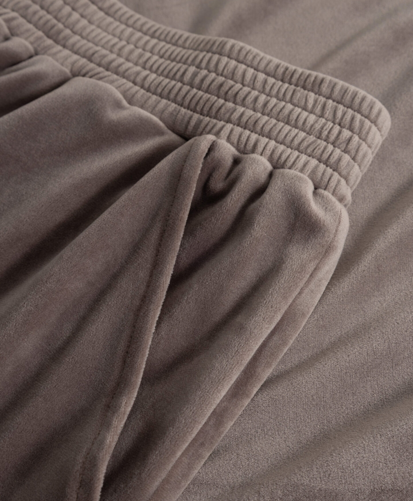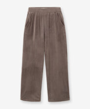 Pruunid veluurdressipüksid on lihtsa, ent elegantse lõikega. Laiad sääred kindlustavad täieliku liikumisvabaduse, muudavad jalad näiliselt pikemaks ning teevad riietuse pisut õhulisemaks. Tänu pehmele venivale värvlile istuvad püksid väga hästi jalas.