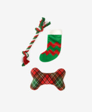 Kinkekomplekt koertele sisaldab mänguasju, mis ärgitavad koera liikuma. Punutud köis sobib sikutamismängudeks ja pehme ruuduline kont on hea närimismänguasi. Komplekt on loodud jõulude ajal koeraga hullamiseks, et pühad mööduksid lõbusalt ka neljajalgsete pereliikmete jaoks.