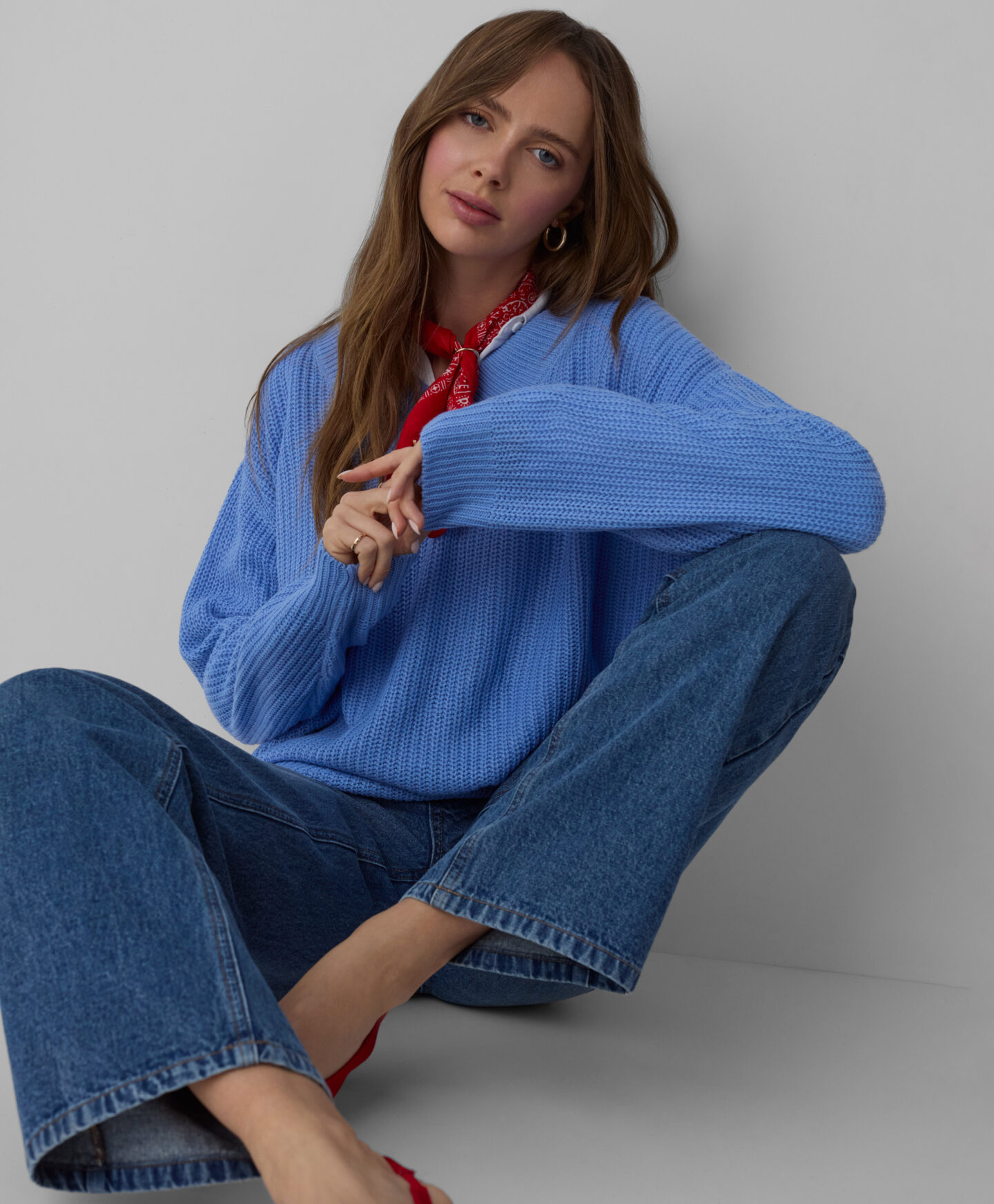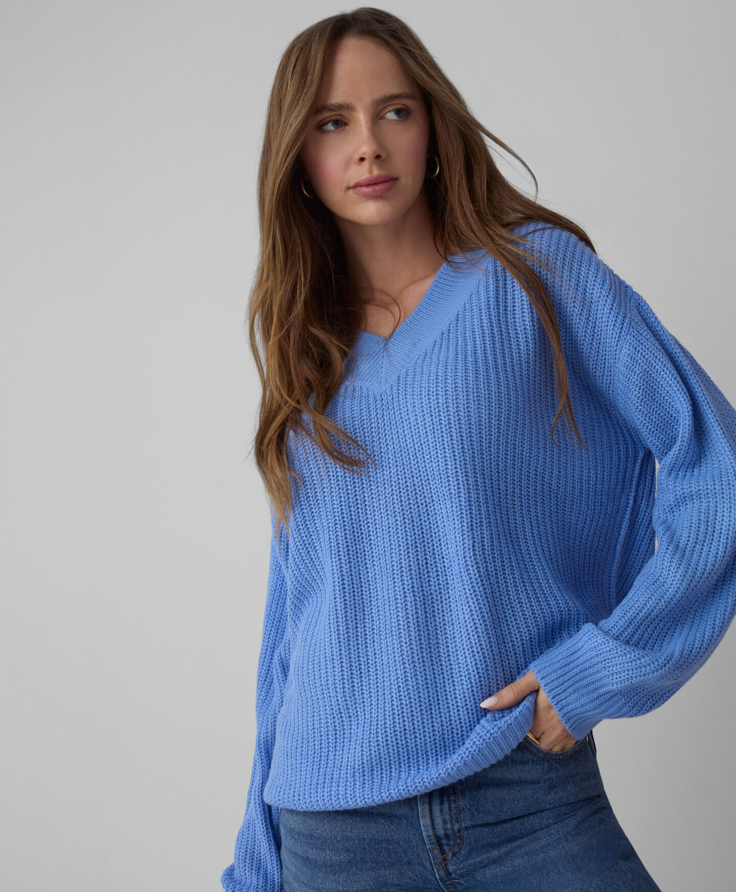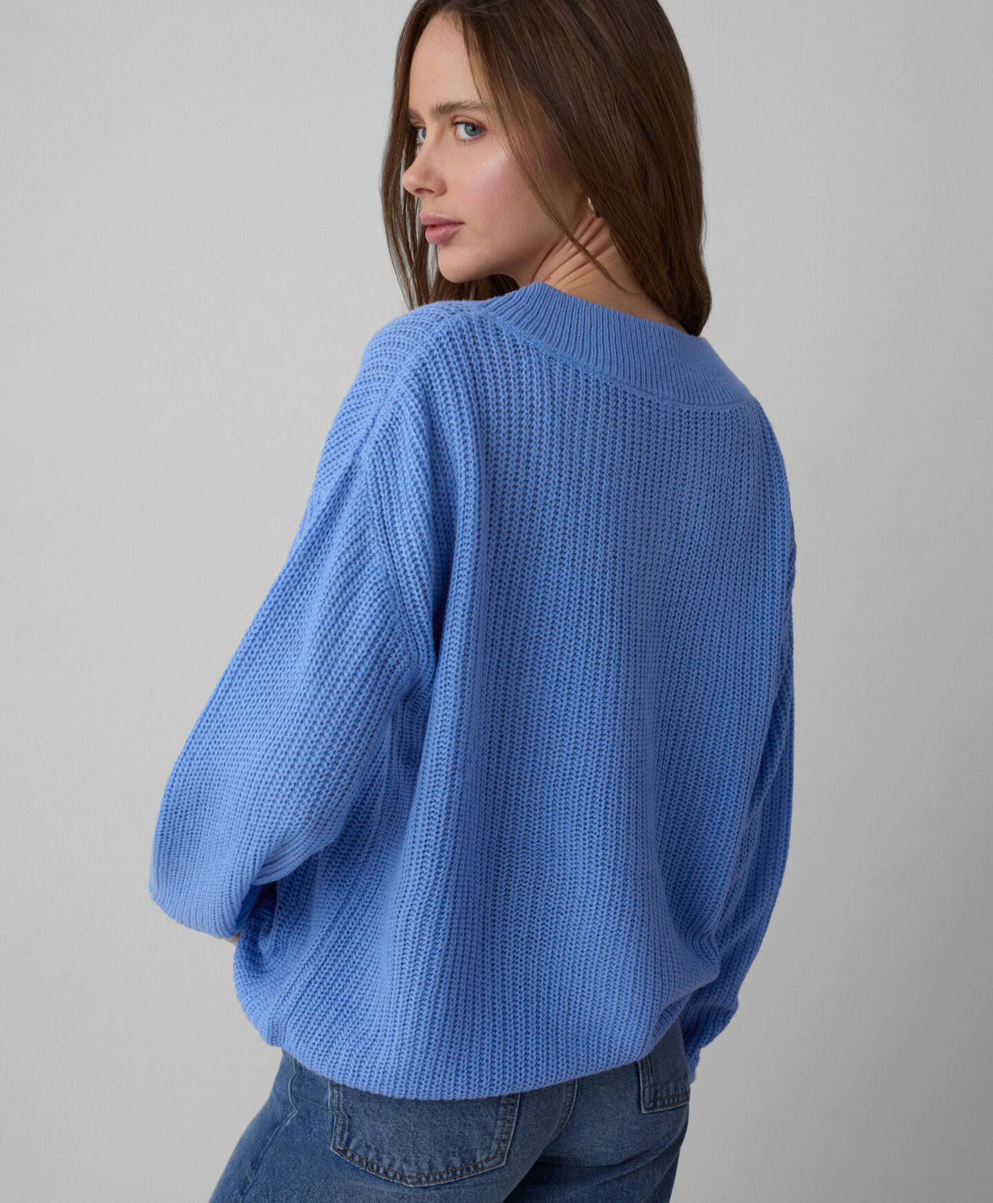 V-kaelusega sinine kampsun on ideaalne igapäevaseks kandmiseks. See on suurepärane valik T-särgi või elegantse pluusi peale tõmbamiseks. Eesmine lõige rõhutab kaela joont ja muudab selle visuaalselt saledamaks, samas kui punutud kudum lisab riietusele karakterit. Kampsun on soe, pehme ja väga naiselik. Saadaval on kaks mustrit.