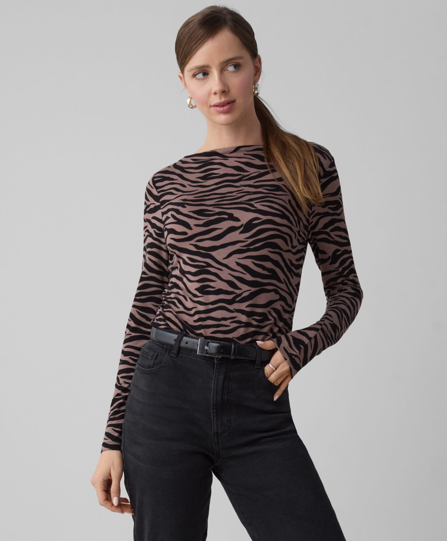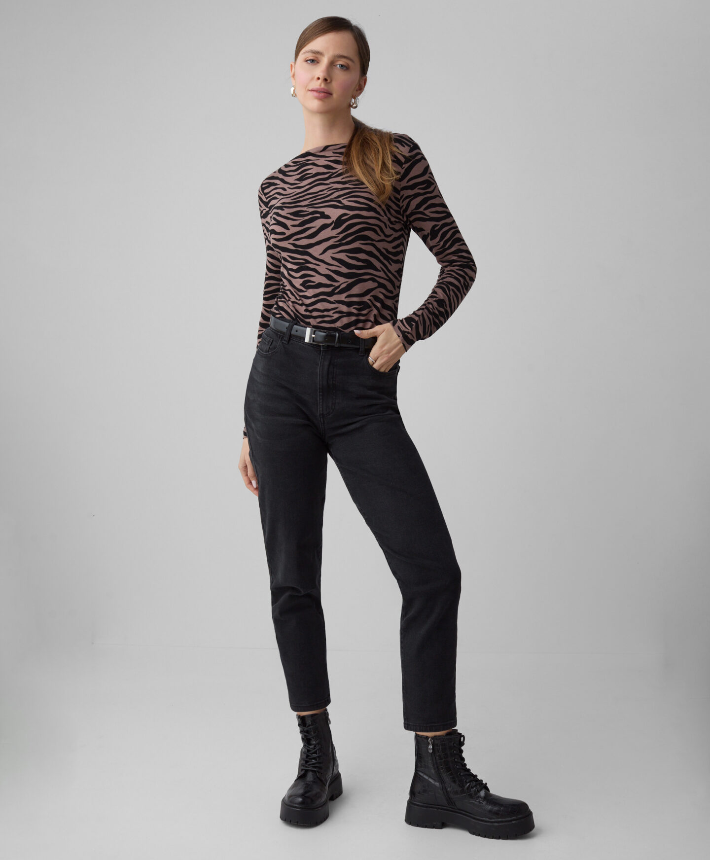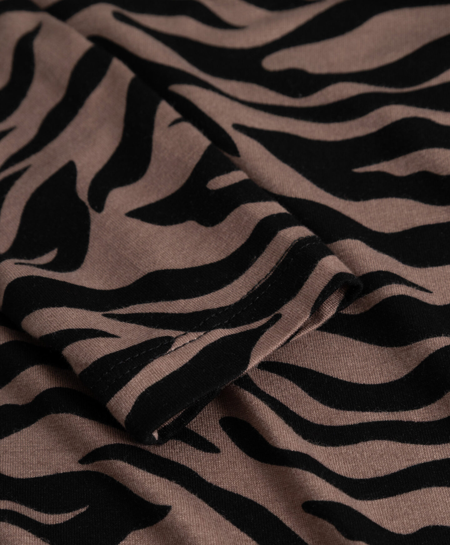 Tiigrimustriga T-särk on ideaalne valik naistele, kes soovivad stiilse riietusega silma paista. See on pehme, hingav ja meeldiv kanda. Kõrge viskoosisisaldus muudab T-särgi kehakujuga kohanduvaks, tagades mugavuse kogu päevaks. Klassikalise ilme saavutamiseks saab seda kombineerida elegantsete pükste ja poolsaabastega või vabama efekti saavutamiseks teksadega.