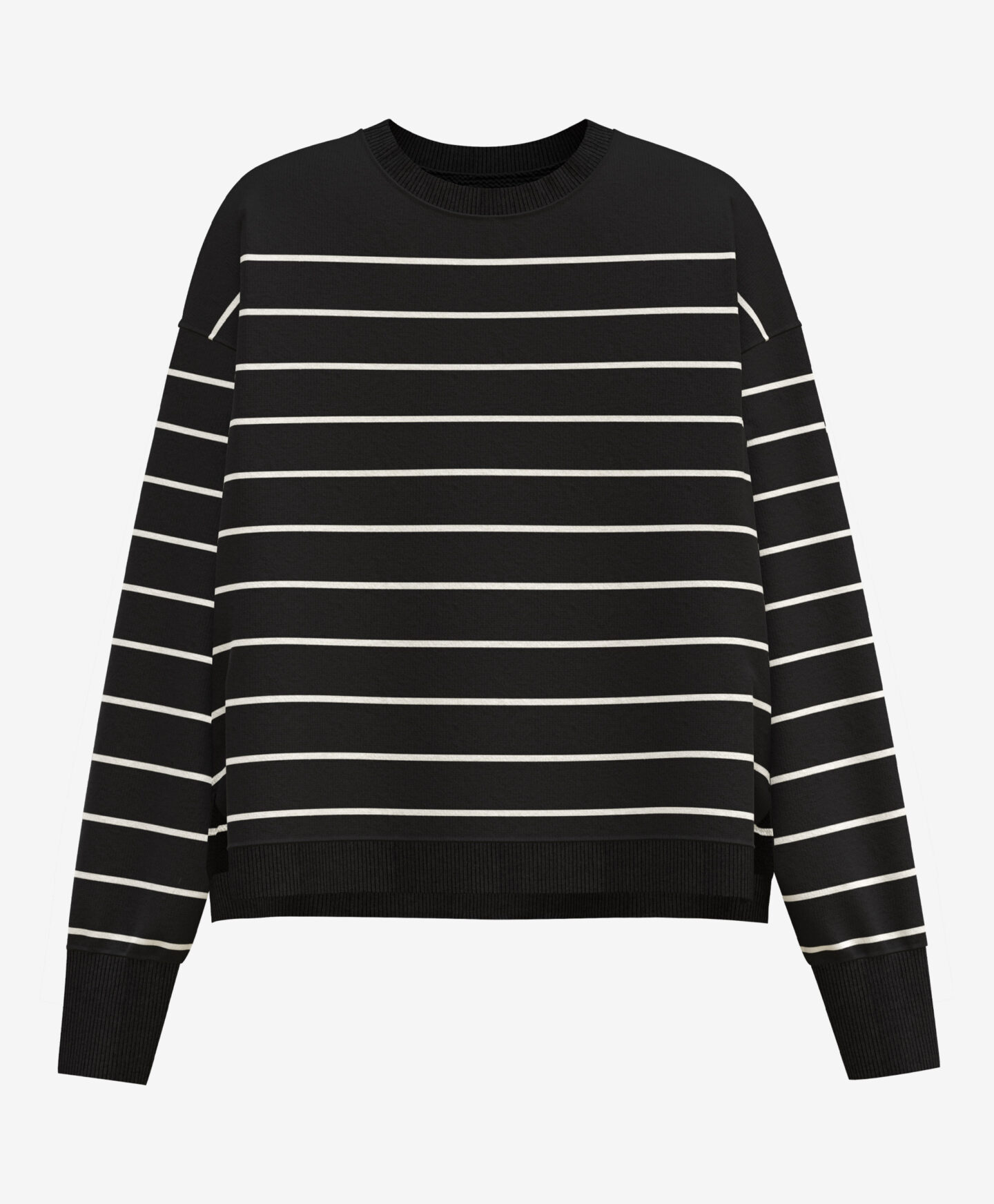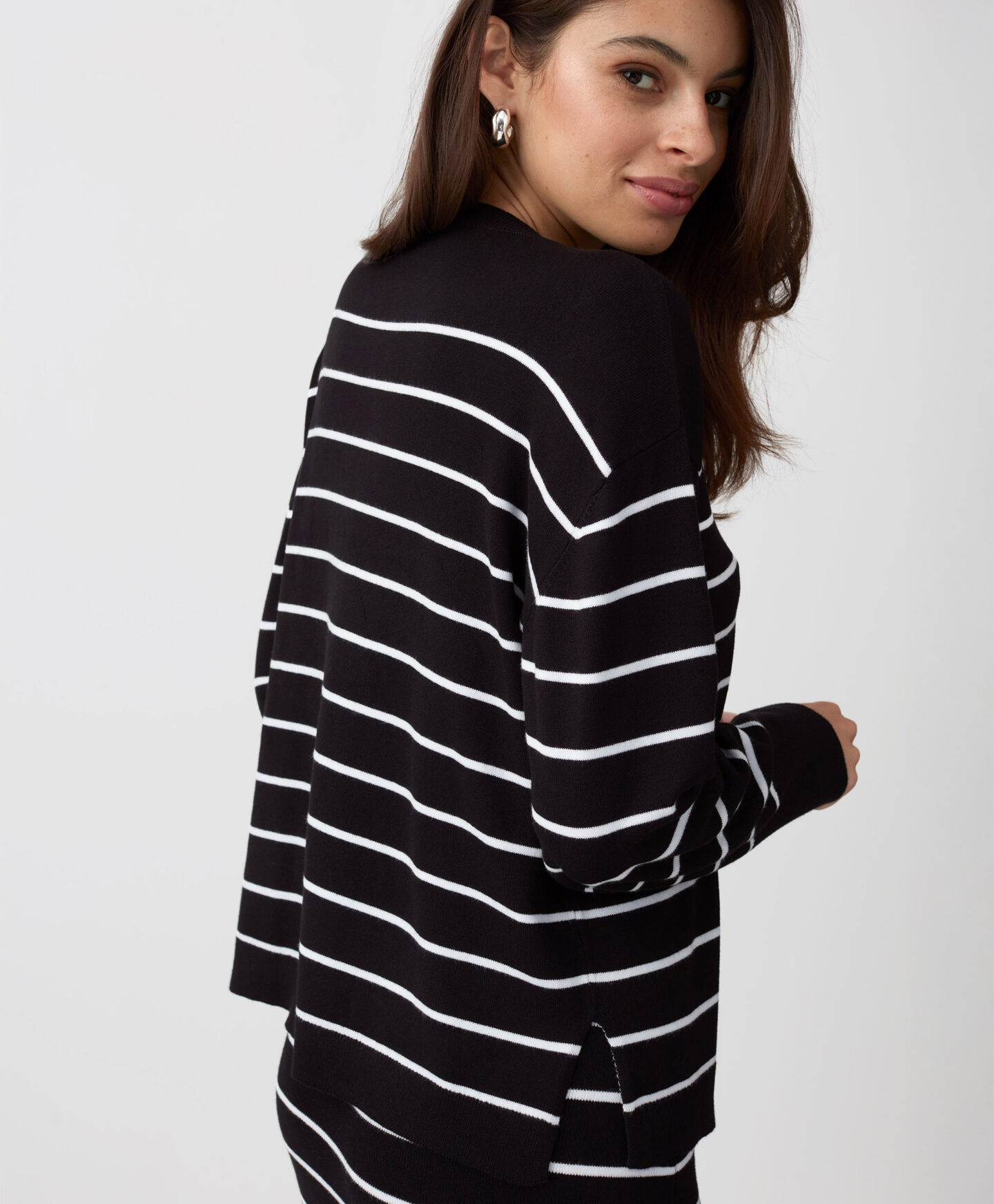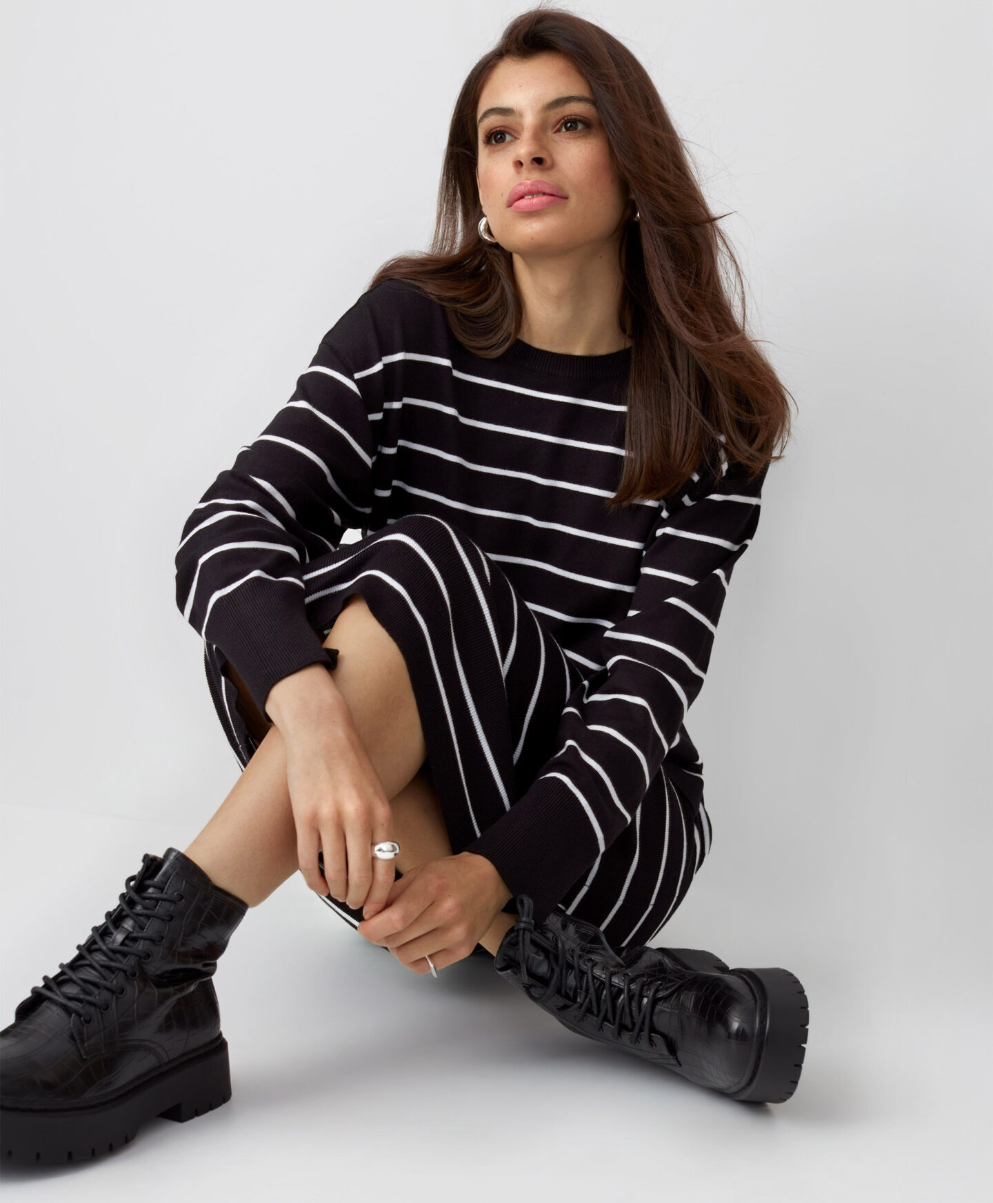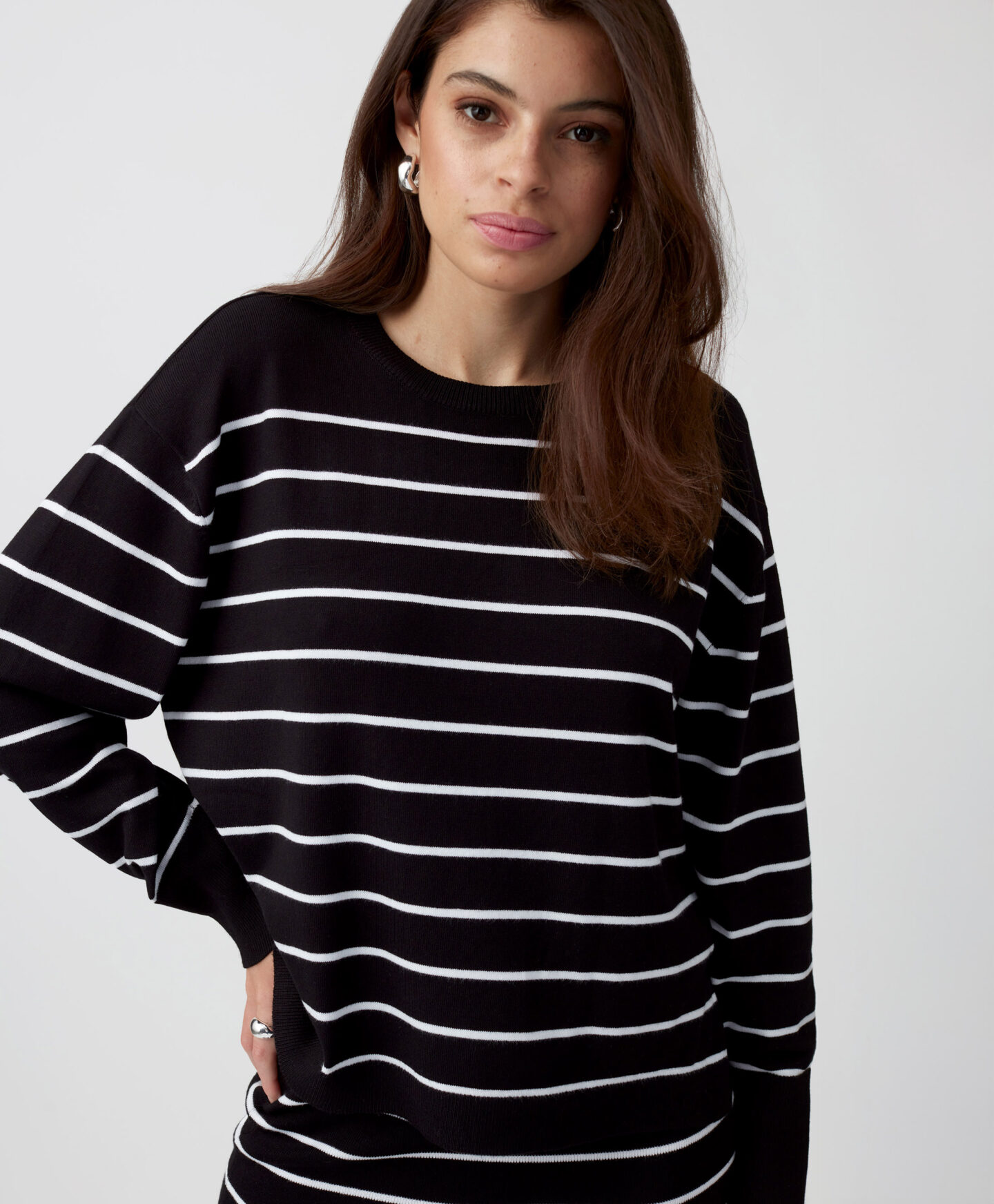 Triibuline kampsun moodustab komplekti sama mustriga seelikuga. See on kerge ja õhuline ning tundub naha vastas mõnus. See langeb ilusti ümber keha ja sobib nii vabaajariietuseks kui ka kontorisse või loengusse. Ajatu triibumuster ei lähe kunagi moest.