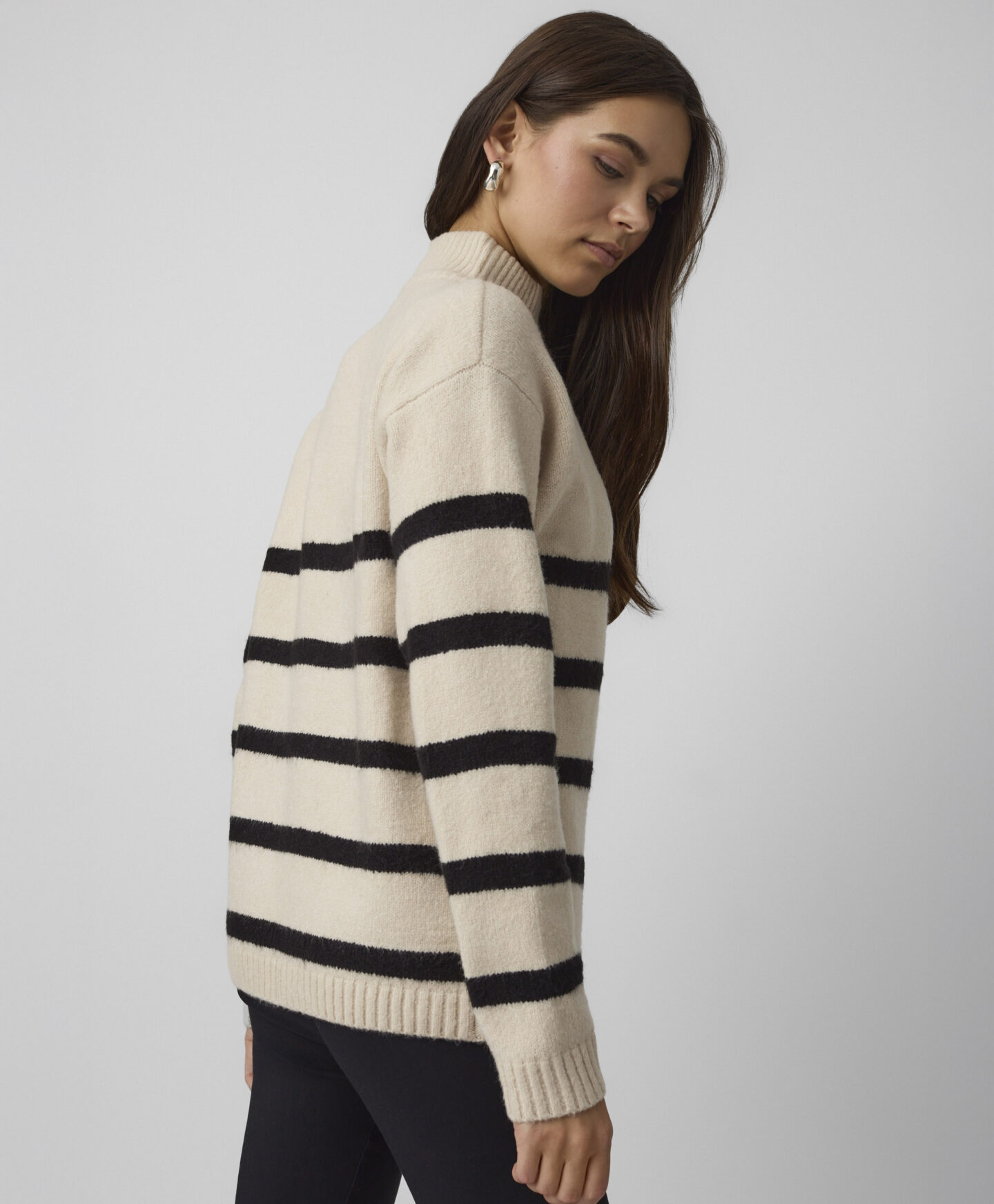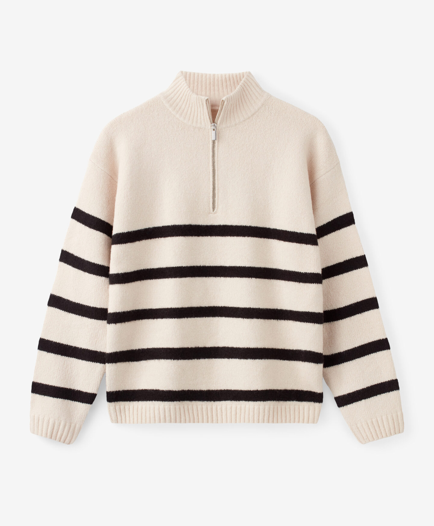 Triibuline kampsun, millel on lukuga kaelus, ühendab klassikalise lõike ja moodsa viimistluse. See on soe ja mõnusalt pehme ehk just see, mida jahedateks sügisilmadeks vaja. Ajatu triibumuster annab riietusele elegantse välimuse ega lähe kunagi moest.