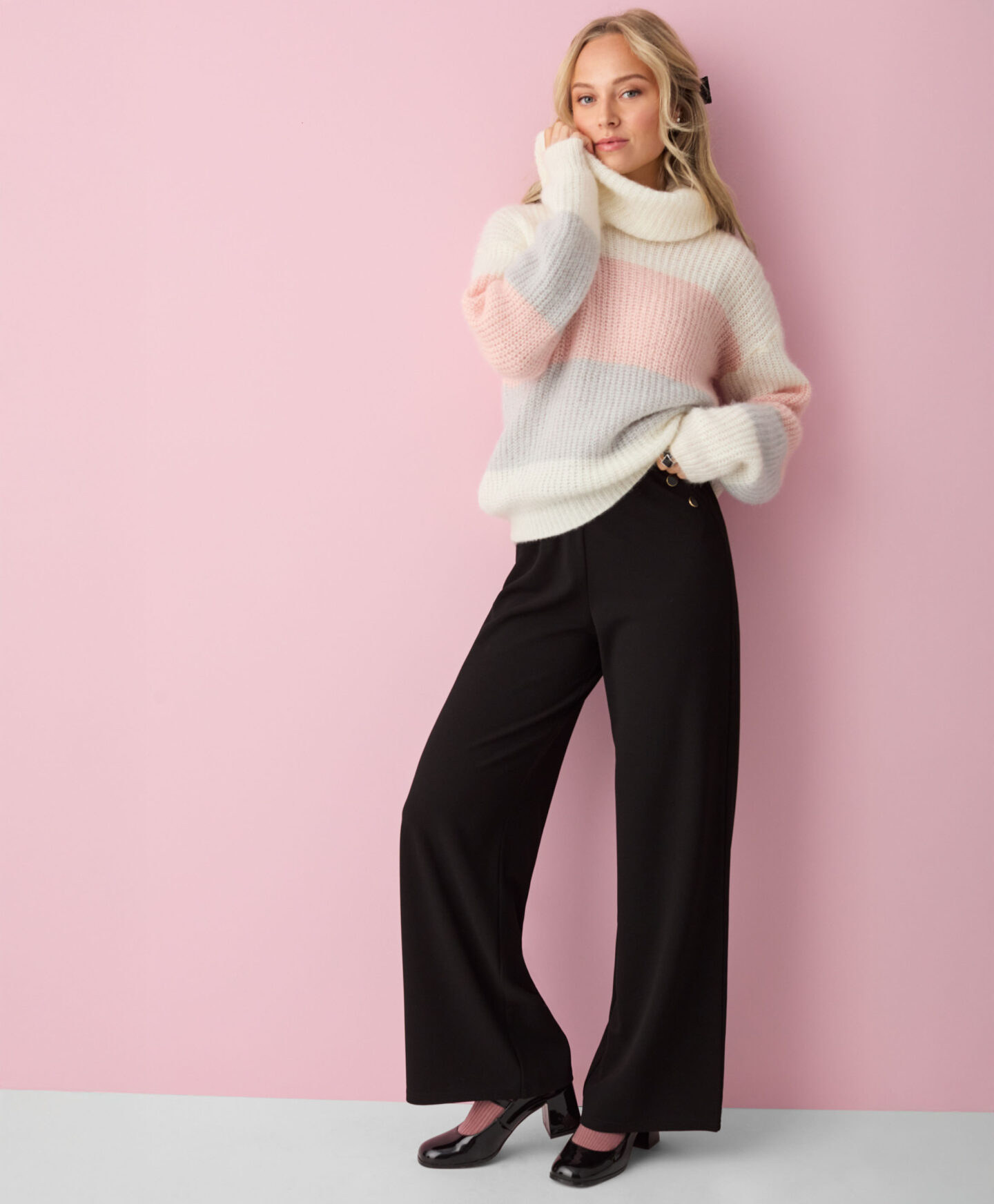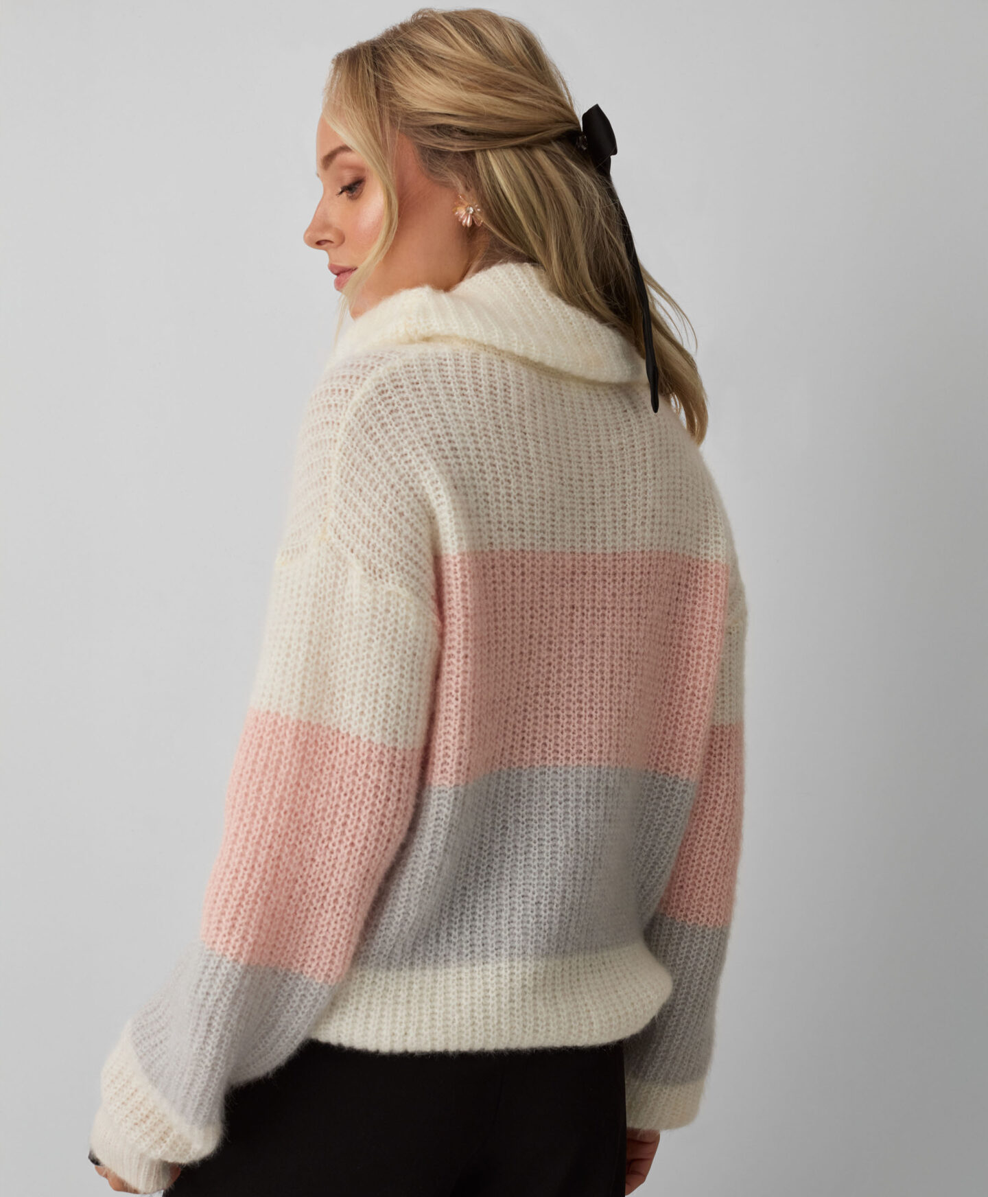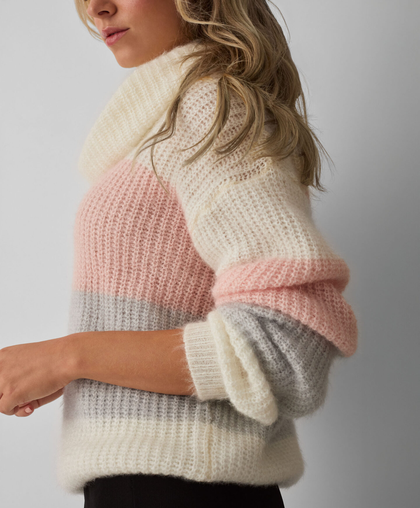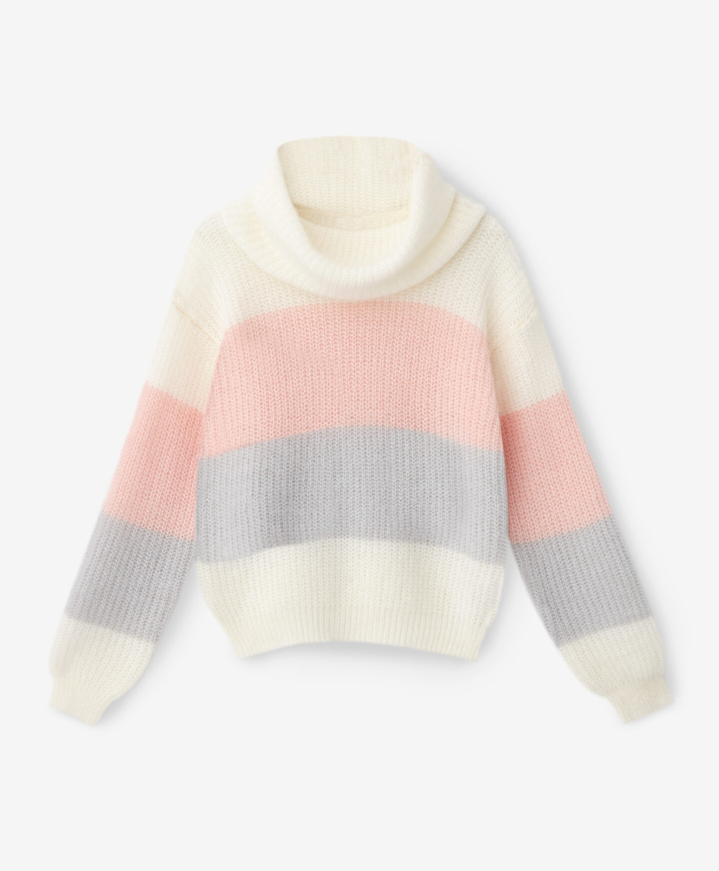 Triibuline kõrge kaelusega kampsun hoiab jahedatel päevadel mõnusalt soojas. See on pehme, soe ja mugav kanda. Laiad pastelsed triibud lisavad välimusele õrnust. Näeb suurepärane välja koos klassikaliste teksade, elegantsete või sportlikuma lõikega pükstega.