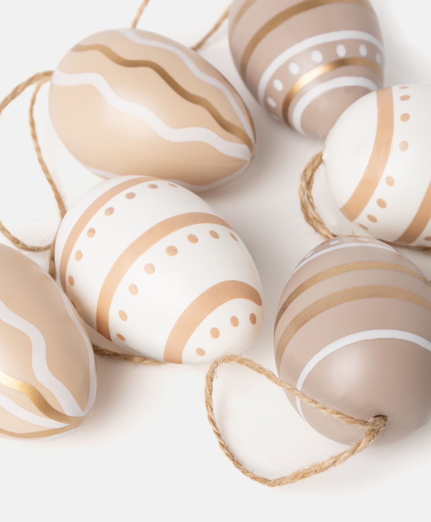 Triibuline munakujuline ripatsite pakk pakub kõike, mida vajad oma kodu, auto või kontori kaunistamiseks. Plastikust ripatsid on kerged, vastupidavad ning täiesti ohutud lastele ja lemmikloomadele. Kõik kuus muna on erksavärvilised ja nende kompaktne suurus muudab need ideaalseks riputamiseks kõikjale, kuhu soovite kevadist võlu lisada.