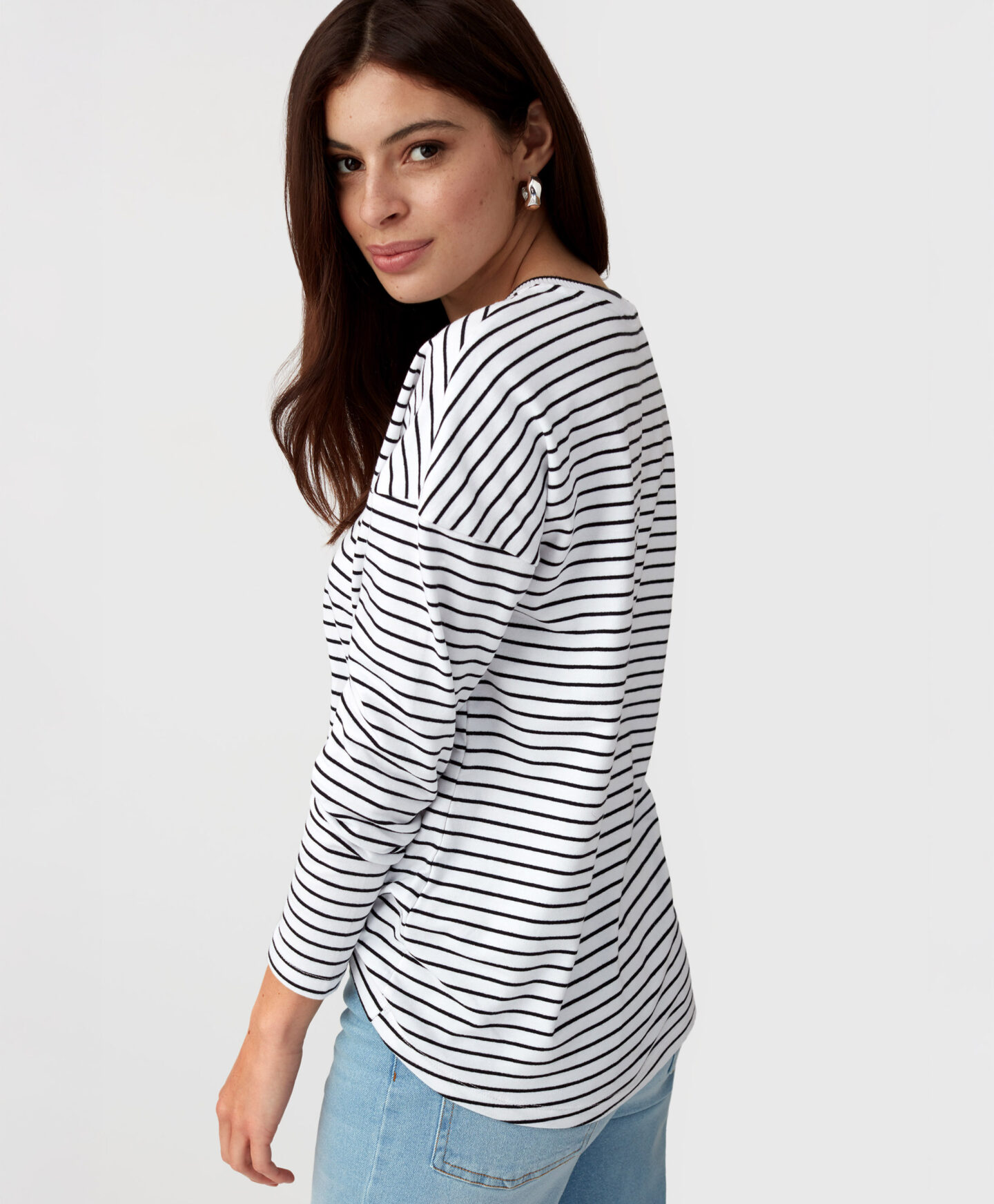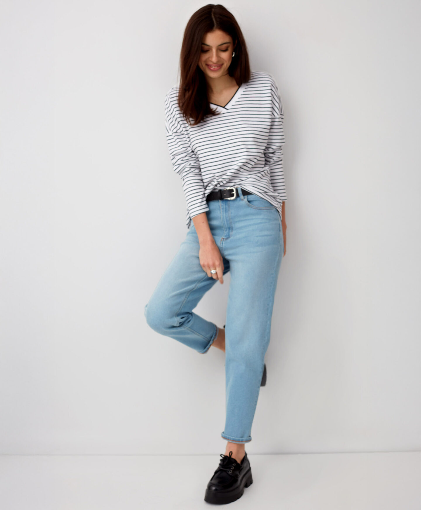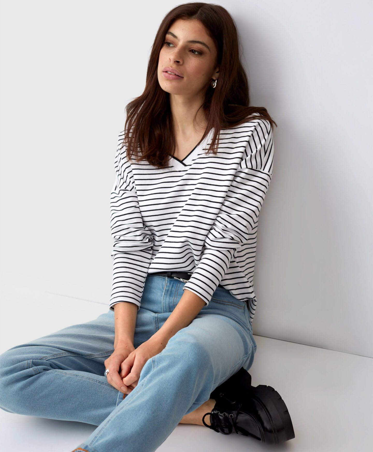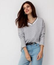 Suure puuvillasisaldusega triibuline T-särk võrdub mugavuse ja stiiliga. Selle universaalne lõige sobib nii elegantse kui ka argise riietuse juurde.