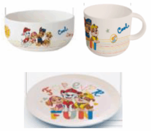PLU 620733 keraamiline kruus 230 ml. lic. Paw Patrol KIDS PLU 620734 keraamiline kauss 540 ml. lic. Psi Patrol KIDS PLU 620736 keraamiline taldrik 19cm lic. Psi Patrol KIDS